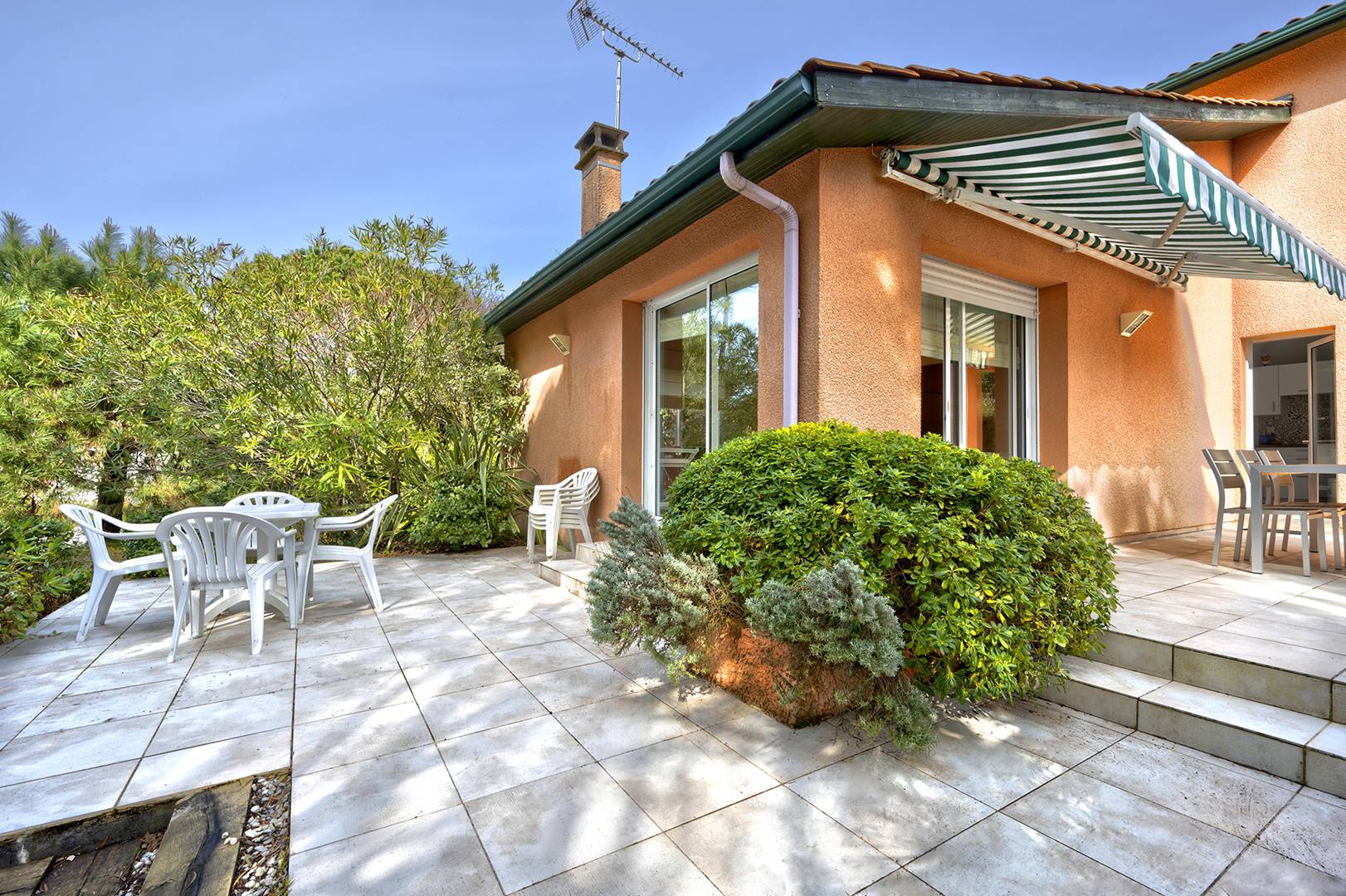Située dans un quartier résidentiel paisible, cette villa confortable d’environ 150 m², répartie sur deux niveaux, vous accueille au cœur d’un environnement arboré de 800 m². Entourée de végétation et baignée de lumière, elle peut accueillir jusqu’à 8 personnes et dispose de 3 chambres, 3 terrasses, 1 salle de bain, 1 salle d’eau et 2 WC.