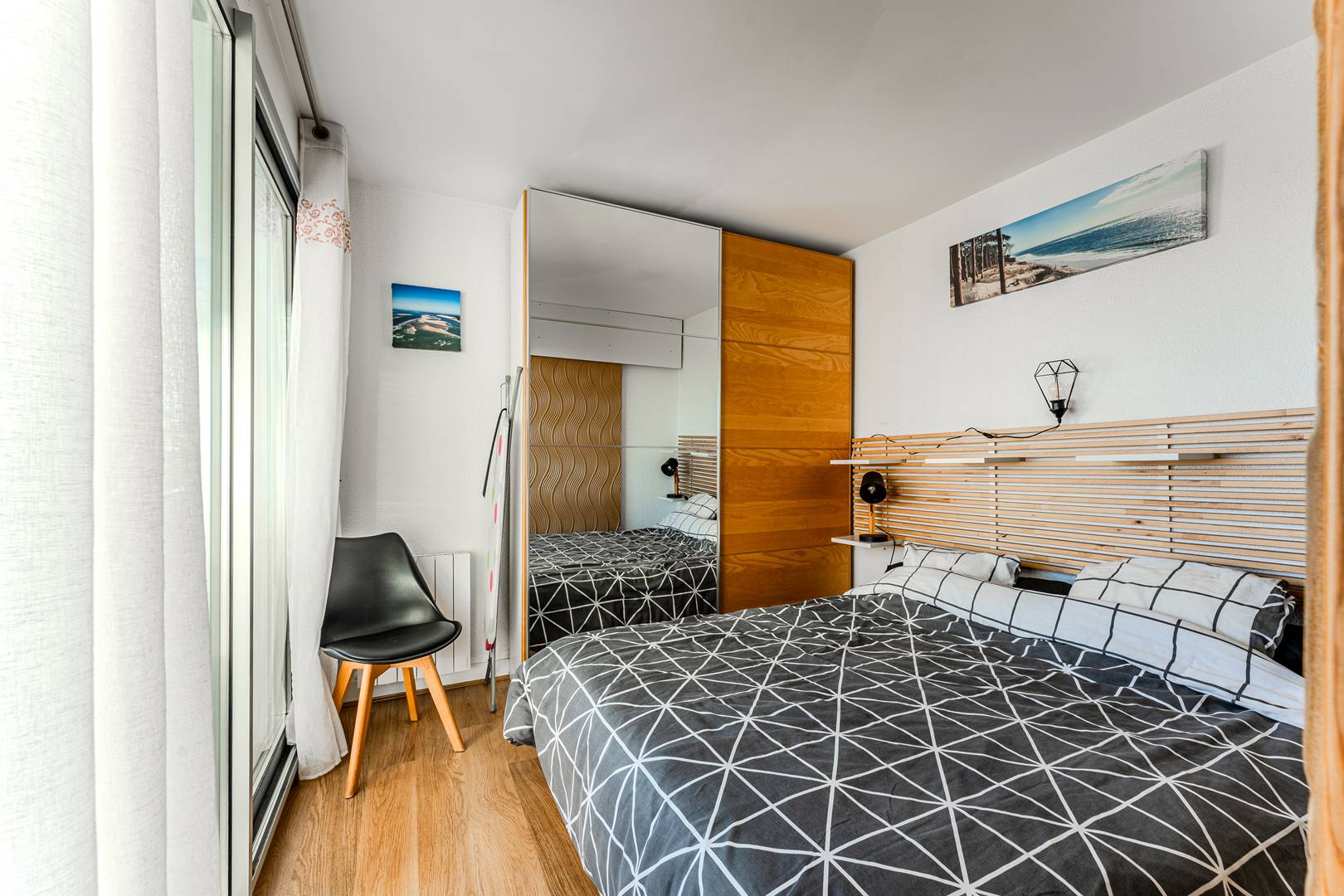 L’entrée distribue une salle d’eau avec lave-linge, des WC séparés ainsi qu’une agréable pièce de vie. La cuisine ouverte, fonctionnelle et entièrement équipée (plaques induction, lave-vaisselle, mini-four, micro-ondes, cafetière électrique Senseo), se prolonge par un coin repas et un salon chaleureux, doté d’un canapé convertible en couchage double (140). Cette pièce s’ouvre sur un 1er balcon exposé nord avec vue sur le port. Côté nuit, une 1ère chambre propose deux lits simples en 90 cm, tandis que la seconde accueille un grand lit double en 160 cm et bénéficie d’un accès direct au 2nd balcon orienté Est, offrant un panorama apaisant sur le bassin et les prés salés. Pour votre confort, l’appartement dispose d’une connexion Internet / WiFi, d’un mobilier de balcon avec transats ainsi que d’un barbecue électrique pour profiter pleinement de l’extérieur. Une place de stationnement privative complète l’ensemble. La résidence met également à disposition une belle piscine extérieure, ouverte du 01/06 au 30/09 de 9h30 à 21h, idéale pour des moments de détente et de fraîcheur après une journée à la plage ou une balade sur le port.