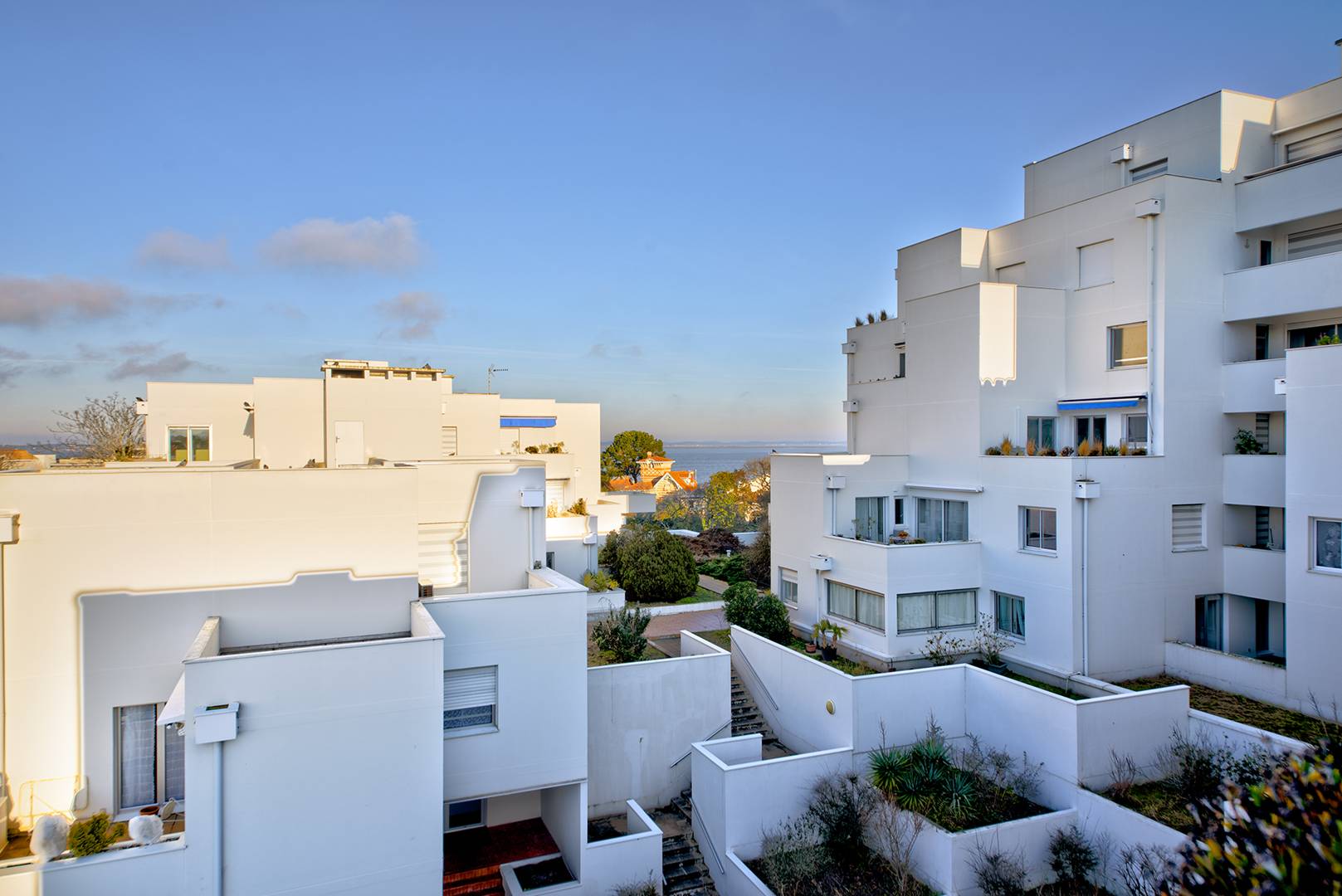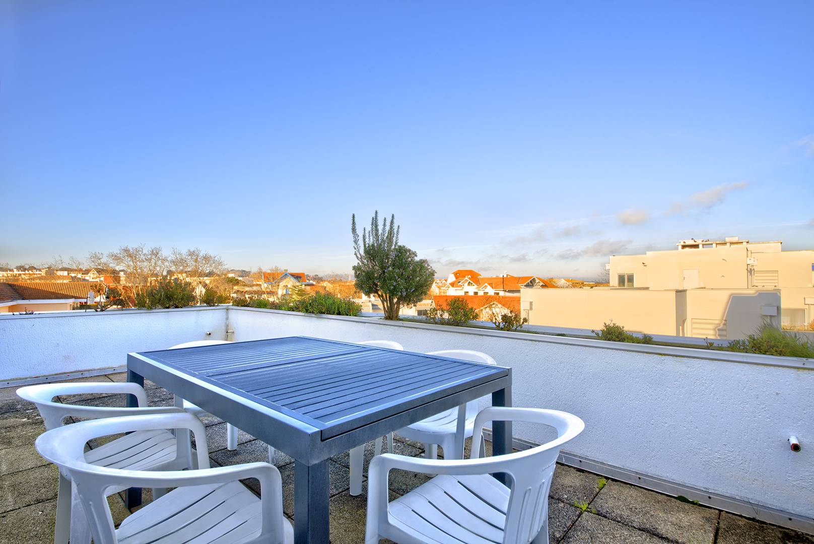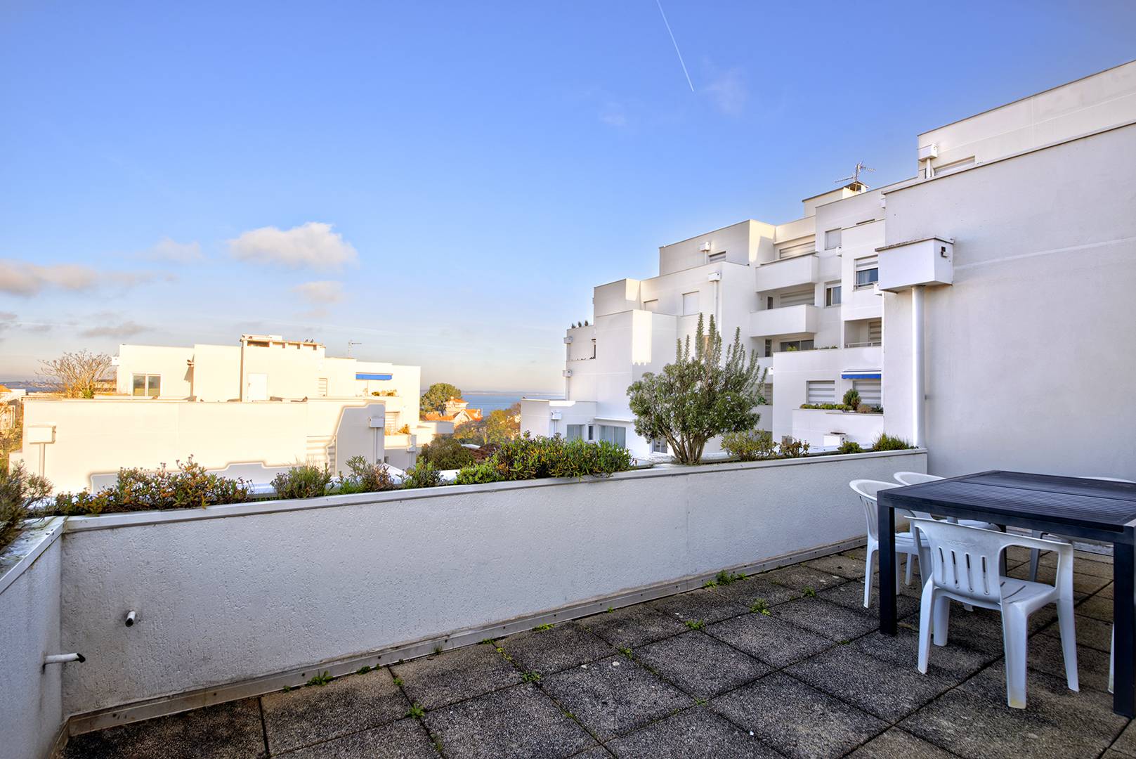 Spacieuse terrasse (plus de 6 m²), accessible depuis la cuisine et le salon, avec une très belle vue dominante sur la ville et le bassin d’Arcachon. Store-banne, mobilier…