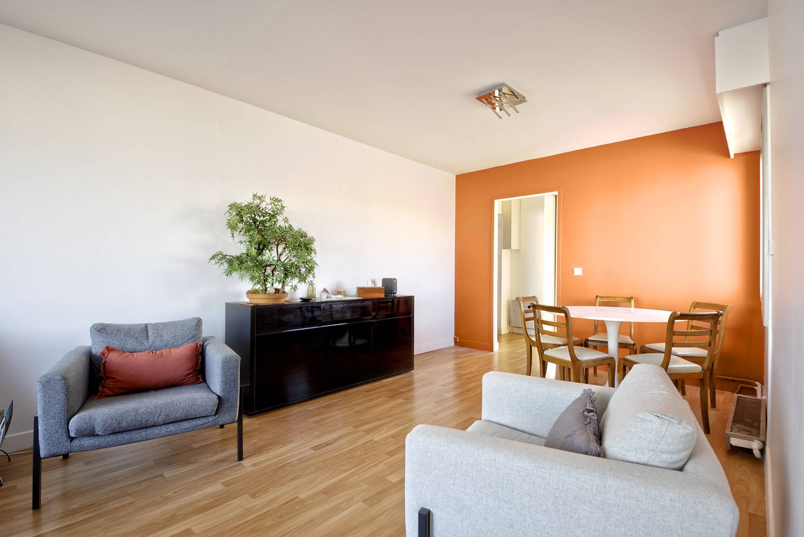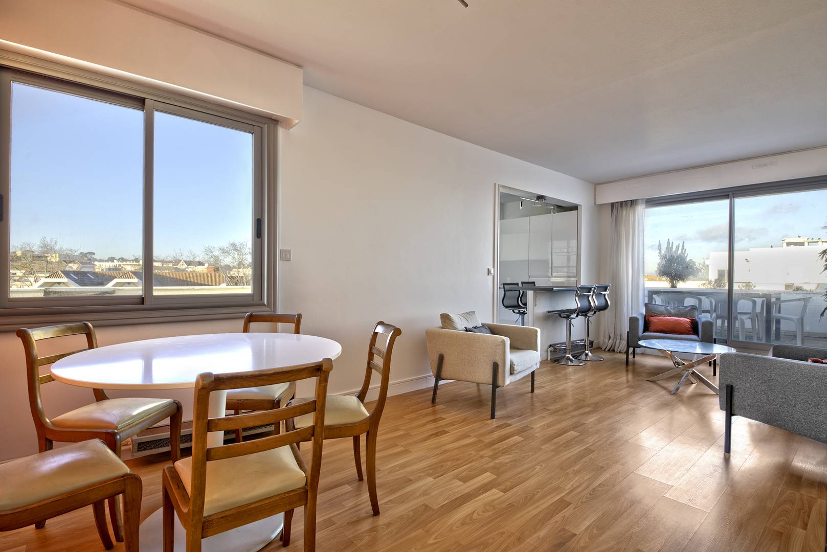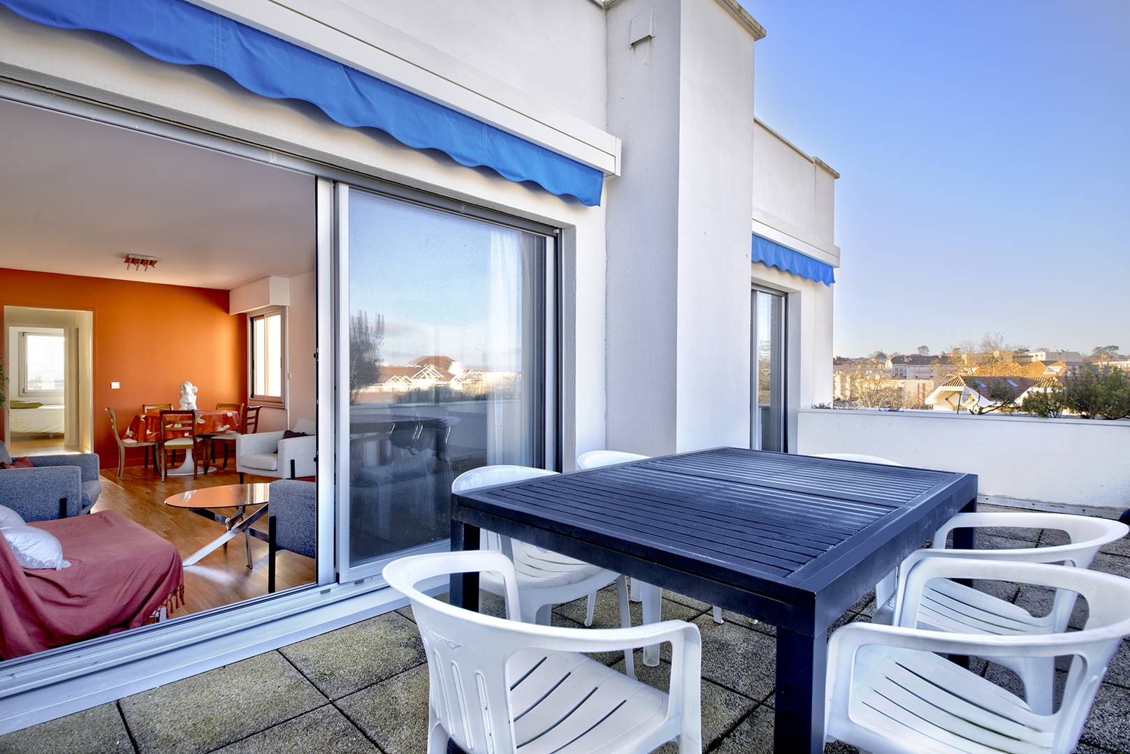 Spacieuse terrasse (plus de 6 m²), accessible depuis la cuisine et le salon, avec une très belle vue dominante sur la ville et le bassin d’Arcachon. Store-banne, mobilier…