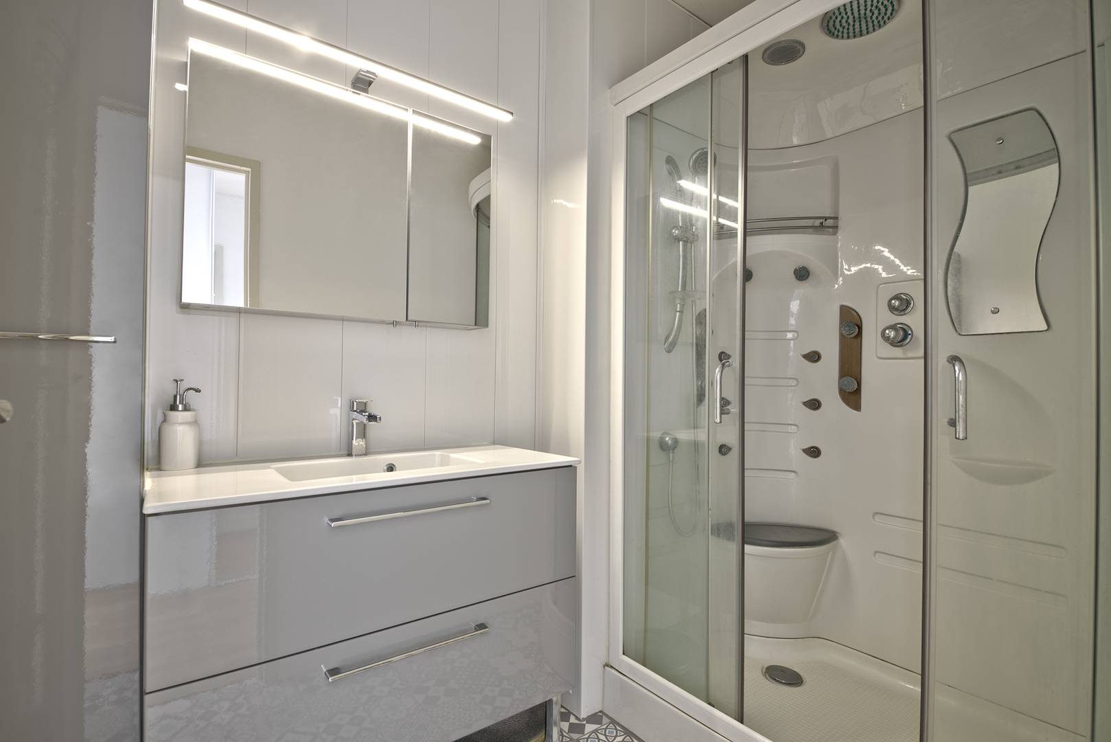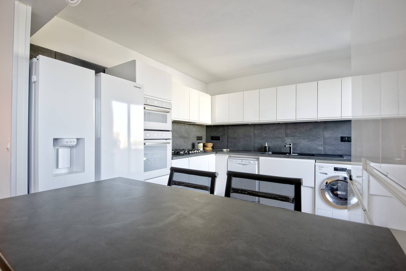 Entrée avec placard / penderie – WC séparés avec lave-mains – Salle d’eau (cabine hydromassante) – Chambre exposée Sud et Ouest : 1 lit en 160, placard / penderie, TV – Salle à manger – Salon exposé Nord : 1 canapé lit en 120, fauteuils, TV… - Très belle cuisine équipée (réfrigérateur américain, four traditionnel, four micro-ondes, hotte, lave-vaisselle, 6 feux gaz, lave-linge / sèche-linge…).