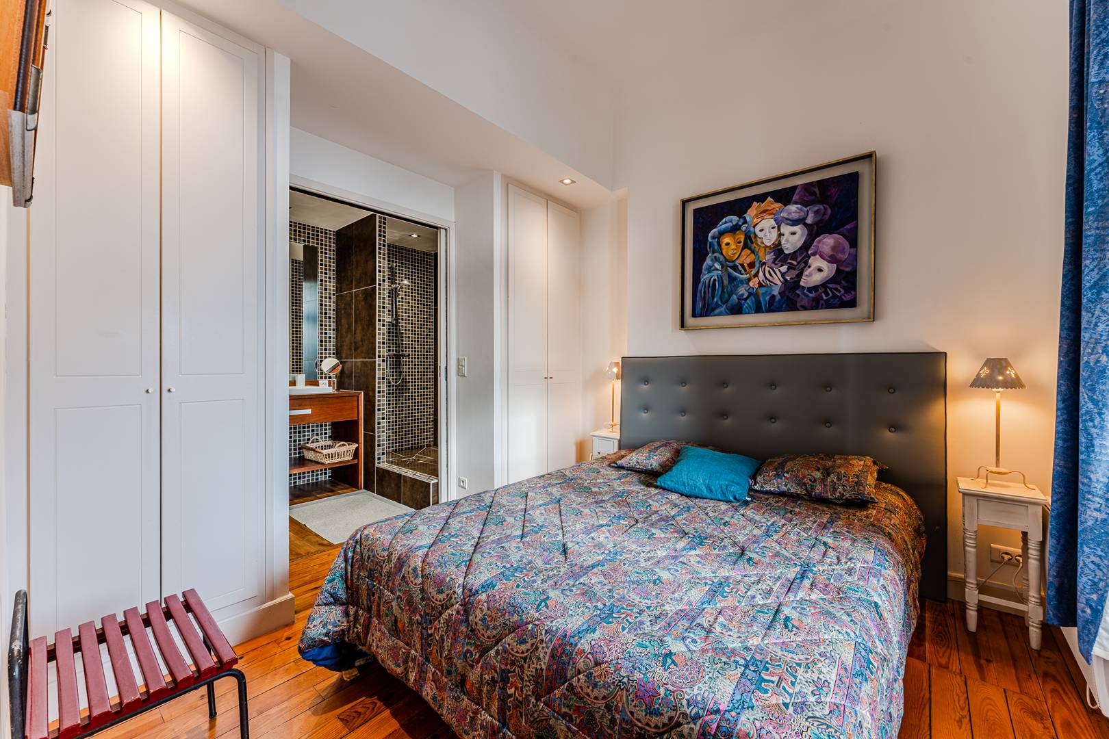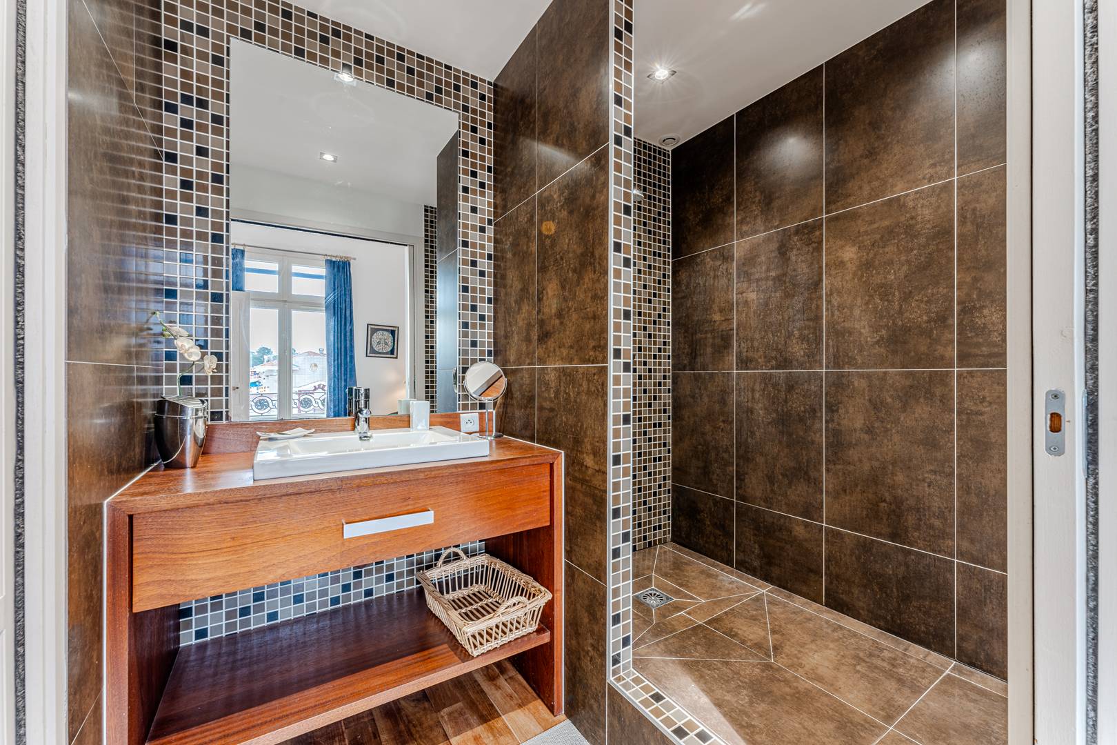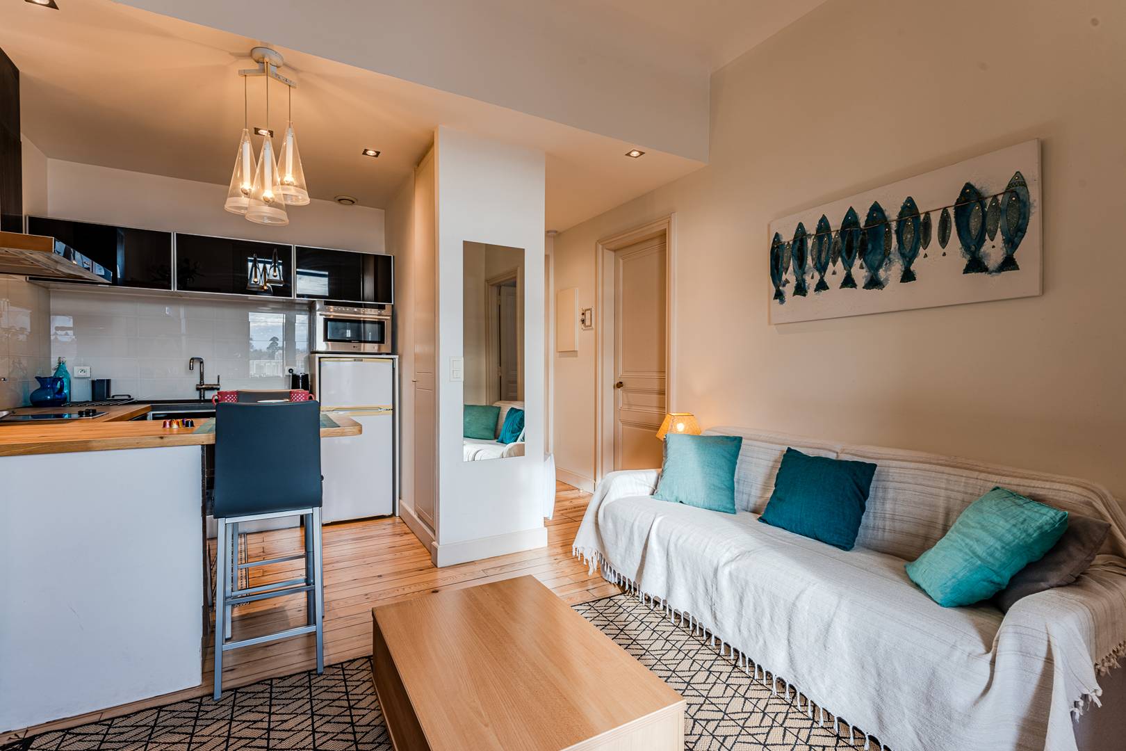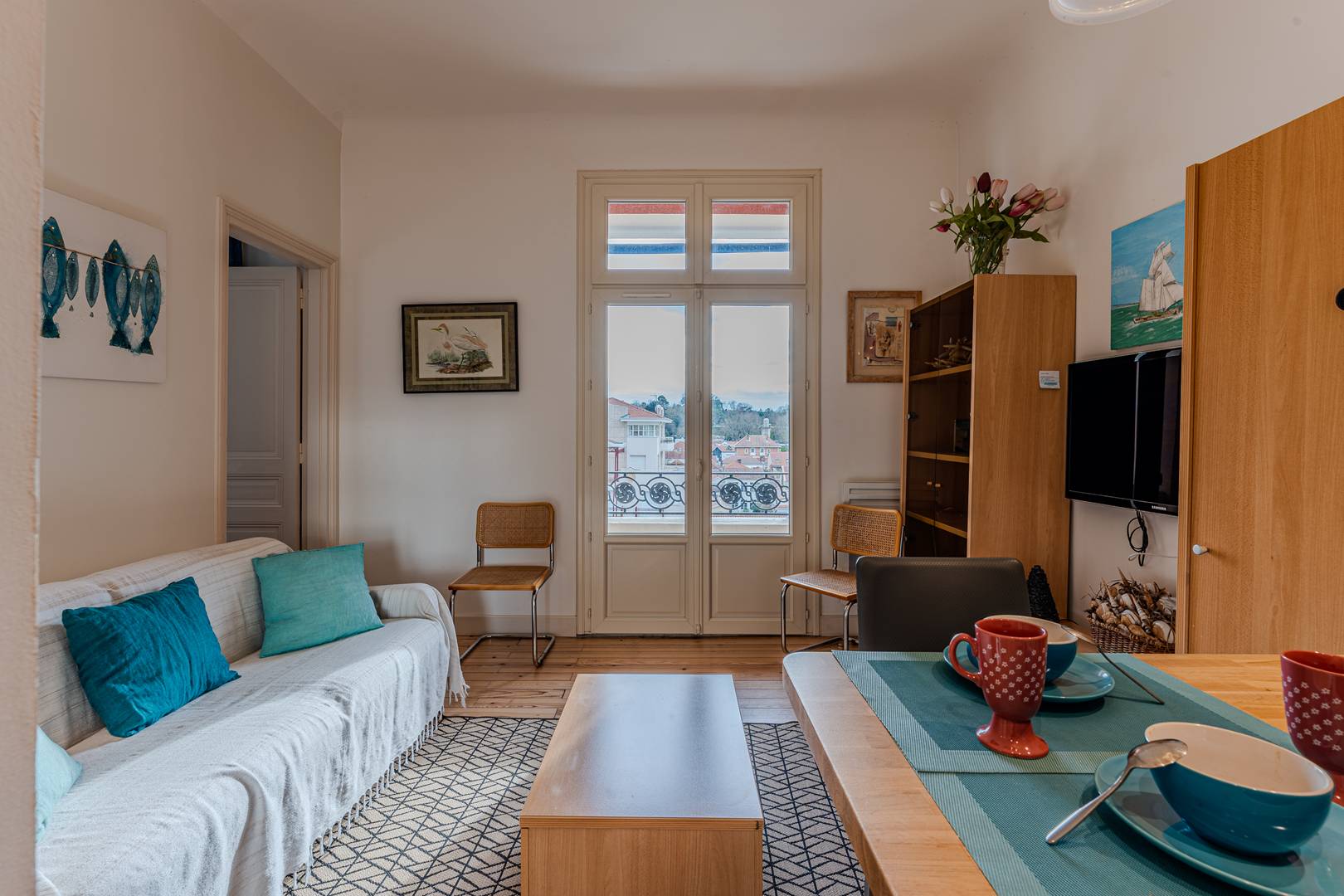 L’appartement se compose d’une entrée avec placard, de WC séparés, puis d’une agréable pièce de vie lumineuse, exposée Sud, comprenant un canapé convertible en 160 cm, une télévision, et une cuisine entièrement équipée (réfrigérateur avec compartiment congélateur, four micro-ondes combiné, plaque électrique deux feux, hotte, lave-vaisselle, machine Nespresso). La cuisine est astucieusement séparée du séjour par un bar avec tabourets, et donne accès à la loggia. La chambre, également ouverte sur la loggia, dispose de deux lits de 80 cm rapprochés (160 cm), d’un placard avec penderie. La salle d’eau, spacieuse et contemporaine, bénéficie d’un double accès : l’un depuis la chambre, l’autre depuis les WC. La loggia d’environ 8 m², exposée plein Sud, est aménagée avec du mobilier extérieur et un store banne, idéale pour profiter du soleil et d’une très belle vue dominante sur la ville d’Arcachon. L’appartement séduit par ses très belles prestations : parquets anciens, décoration contemporaine soignée, et emplacement exceptionnel.
