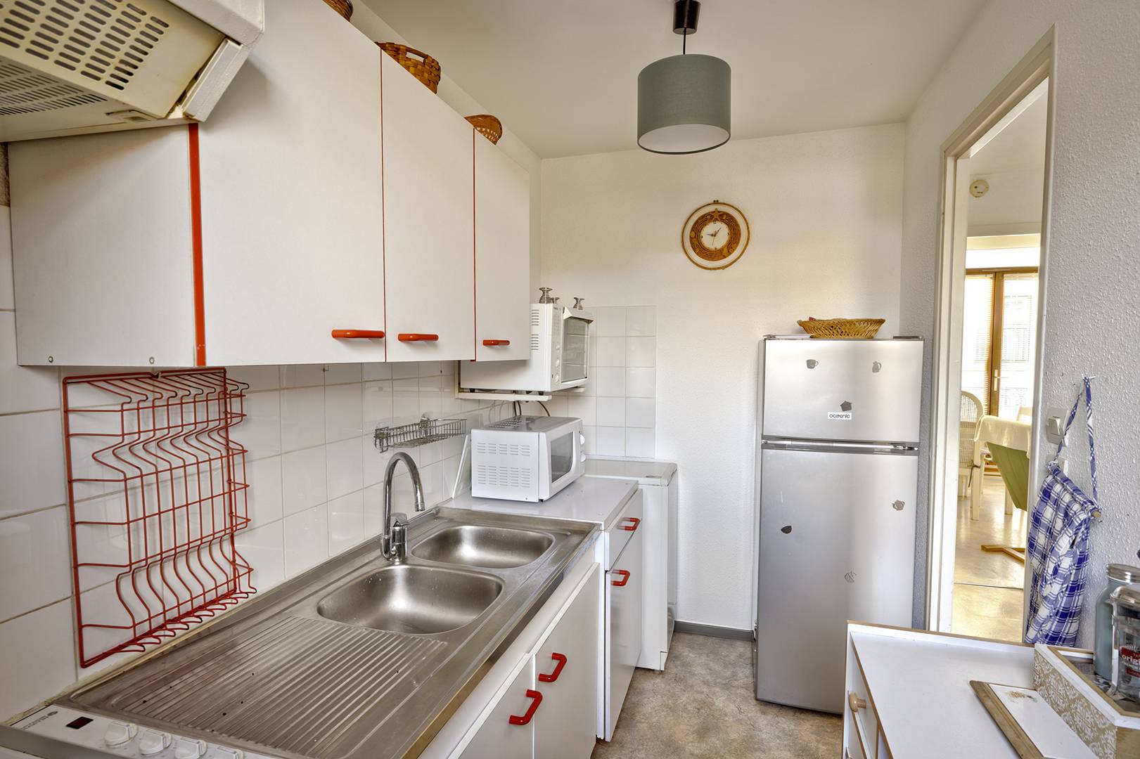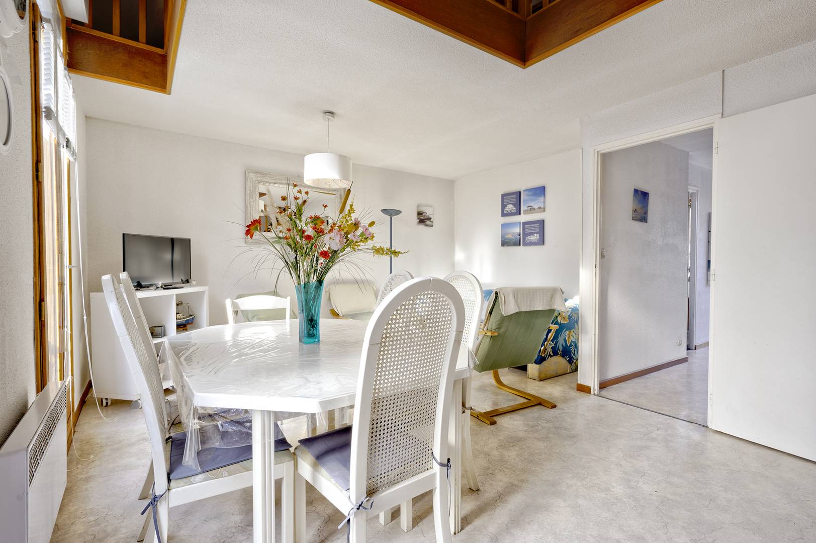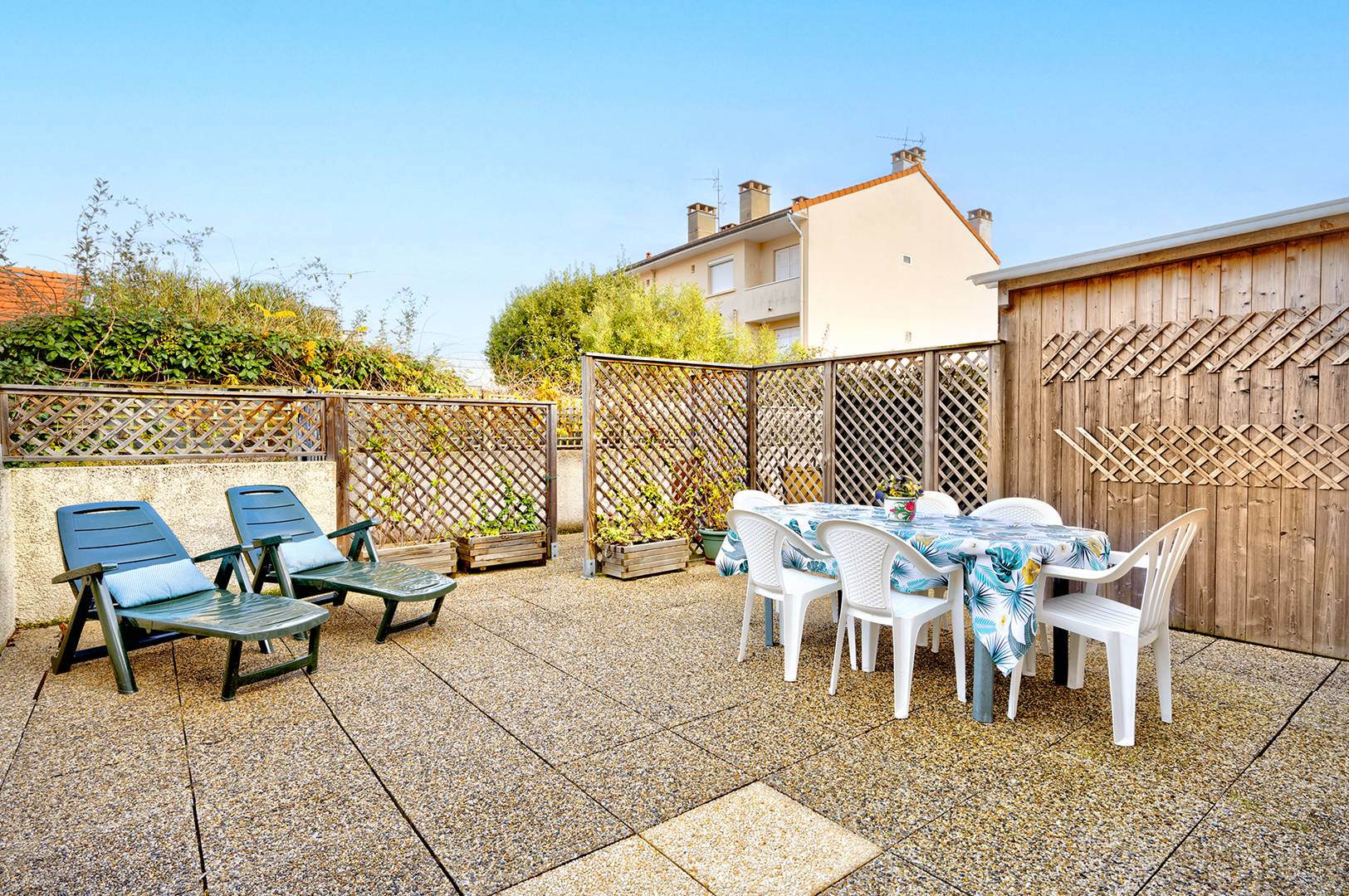 Dès l’entrée, un couloir mène à une première chambre, exposée au Nord, équipée de deux lits simples, d'une commode et d'un espace de rangement. La cuisine, séparée et entièrement équipée, comprend des plaques électriques, une hotte, un four micro-ondes, un mini-four, un réfrigérateur avec compartiment congélateur, et un lave-linge. Les WC sont indépendants, avec lave-mains, pour plus de confort. Le salon, lumineux et exposé au Sud, bénéficie de deux fenêtres donnant sur la rue, chacune avec son petit balcon à la parisienne. Cet espace se compose d’un coin salon avec canapé, fauteuils et télévision, ainsi que d’une salle à manger. L'accès à l'étage se fait par un escalier un peu raide de 13 marches. À l’étage, un palier moquetté dispose d’un lit gigogne offrant deux couchages supplémentaires. La seconde chambre, exposée au Nord et éclairée par un Velux, est équipée d’un lit double et d’une armoire. Une salle de bain avec WC complète ce niveau. La terrasse, d’environ 25 m², est un véritable atout pour profiter de repas en extérieur ou de moments de détente en plein air, avec du mobilier de jardin à disposition. L’appartement est accessible par plusieurs marches depuis la rue et bénéficie d’un emplacement idéal, en plein cœur de ville, à seulement 3 minutes à pied de la plage et 4 minutes du marché municipal. Situé en zone piétonne l’été, il offre un environnement calme. Bien que l'ensemble soit d’époque, l’appartement est fonctionnel. Stationnement dans la rue (payant).