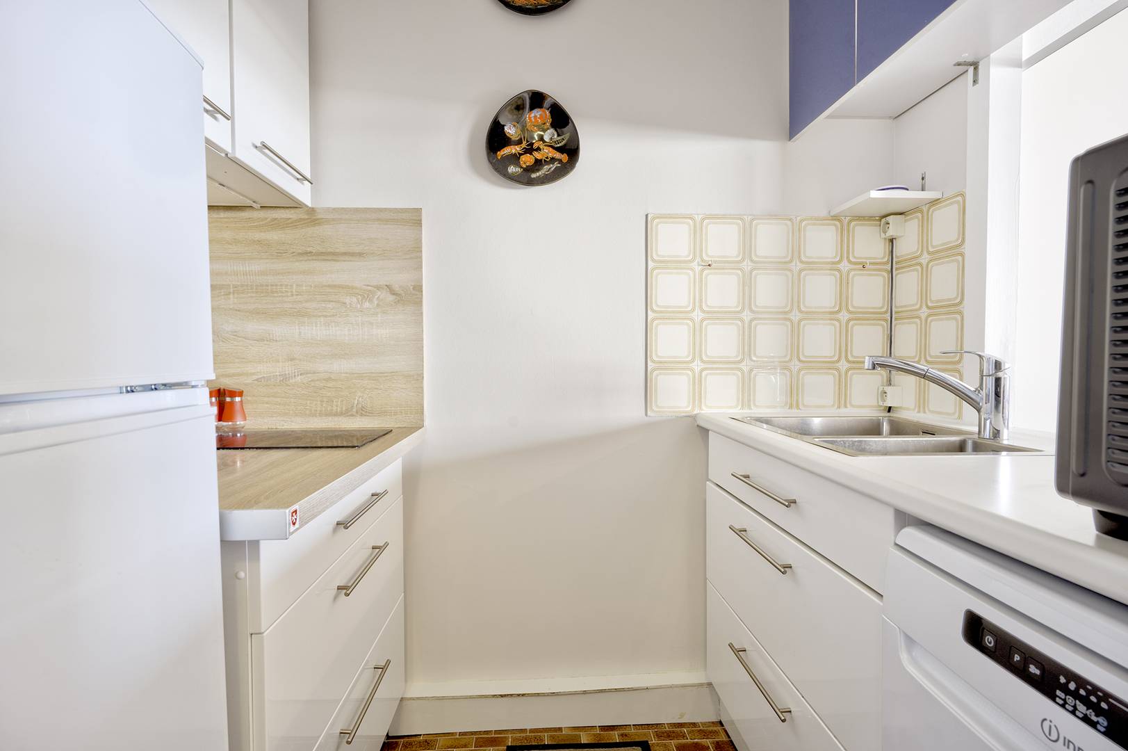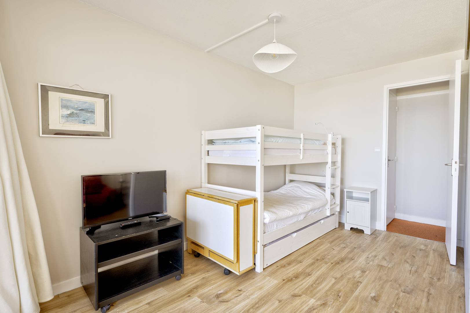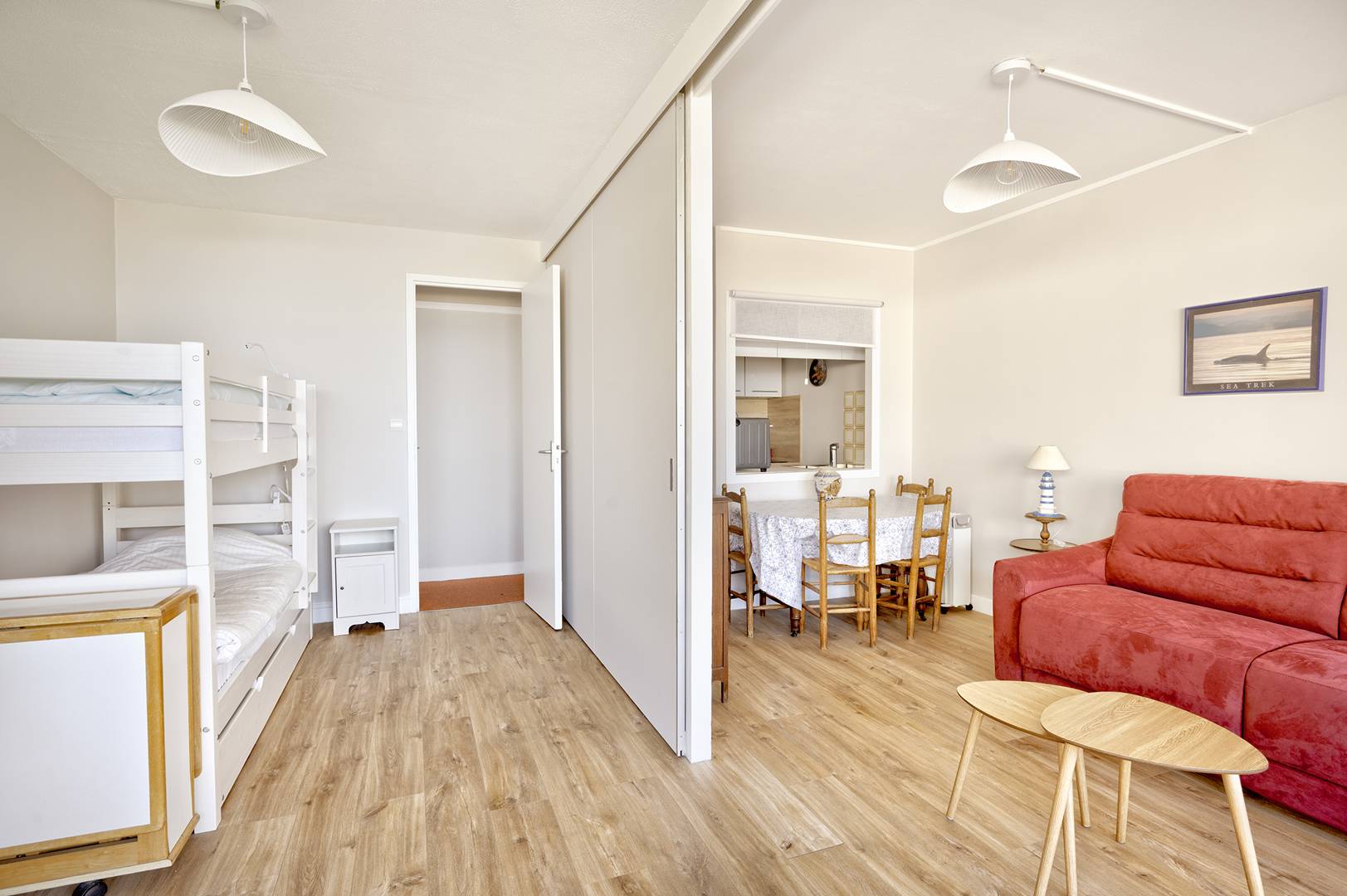 L’agencement comprend un couloir d’entrée avec placards, des WC séparés, une salle de bain équipée d’un lave-linge, ainsi qu’une cuisine fonctionnelle et équipée (réfrigérateur avec congélateur, plaques à induction, micro-ondes, mini-four et lave-vaisselle, Nespresso). La pièce de vie, spacieuse et lumineuse, est modulable grâce à une cloison amovible. Elle se divise en une chambre avec 2 lits superposés (80 cm) et 1 lit tiroir (80 cm), équipée d’une télévision, ainsi qu’un salon/salle à manger doté d’un canapé-lit (140 cm). Cette pièce s’ouvre sur un balcon d’environ 10 m², orienté au nord, aménagé avec du mobilier pour se détendre ou partager des repas en plein air.