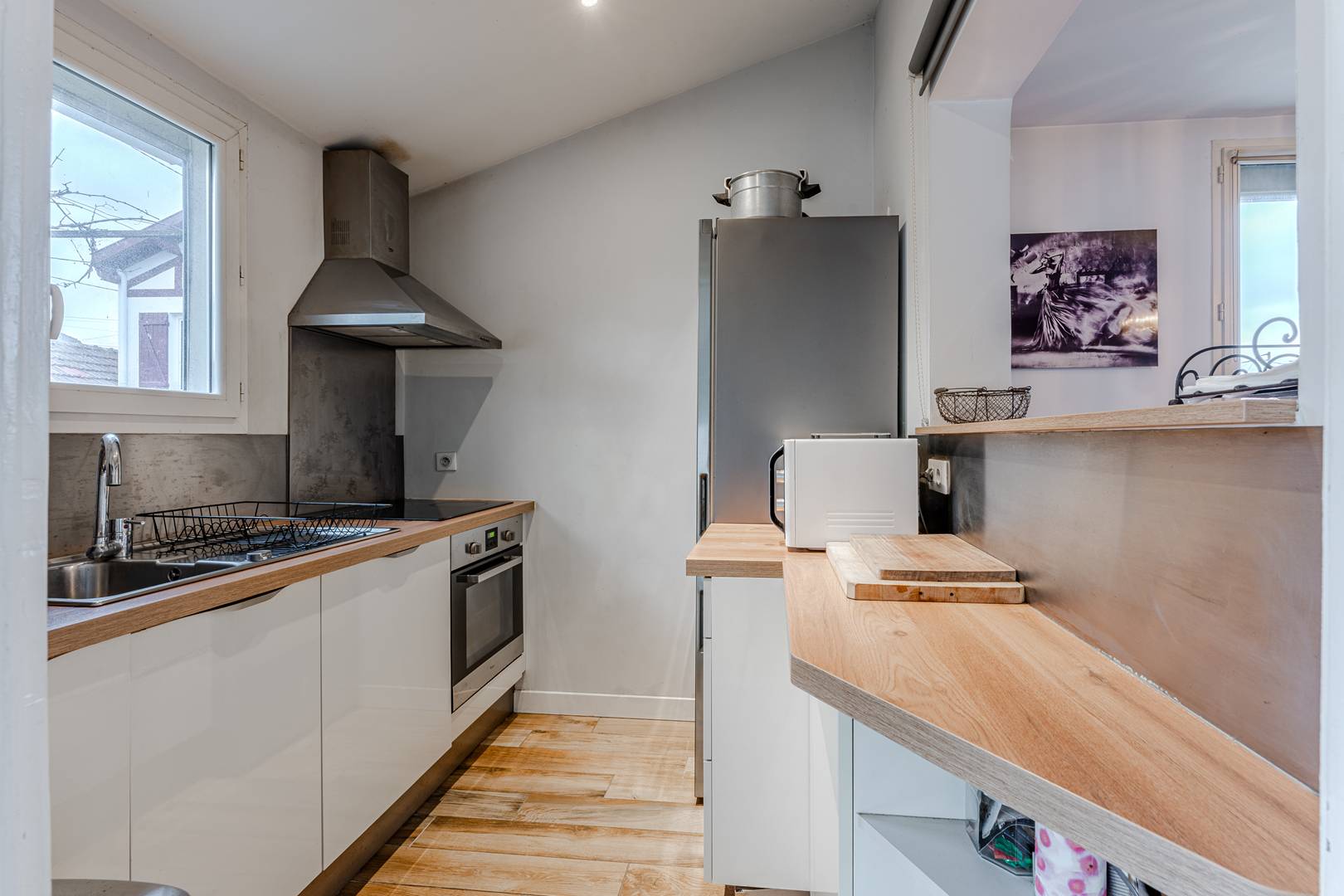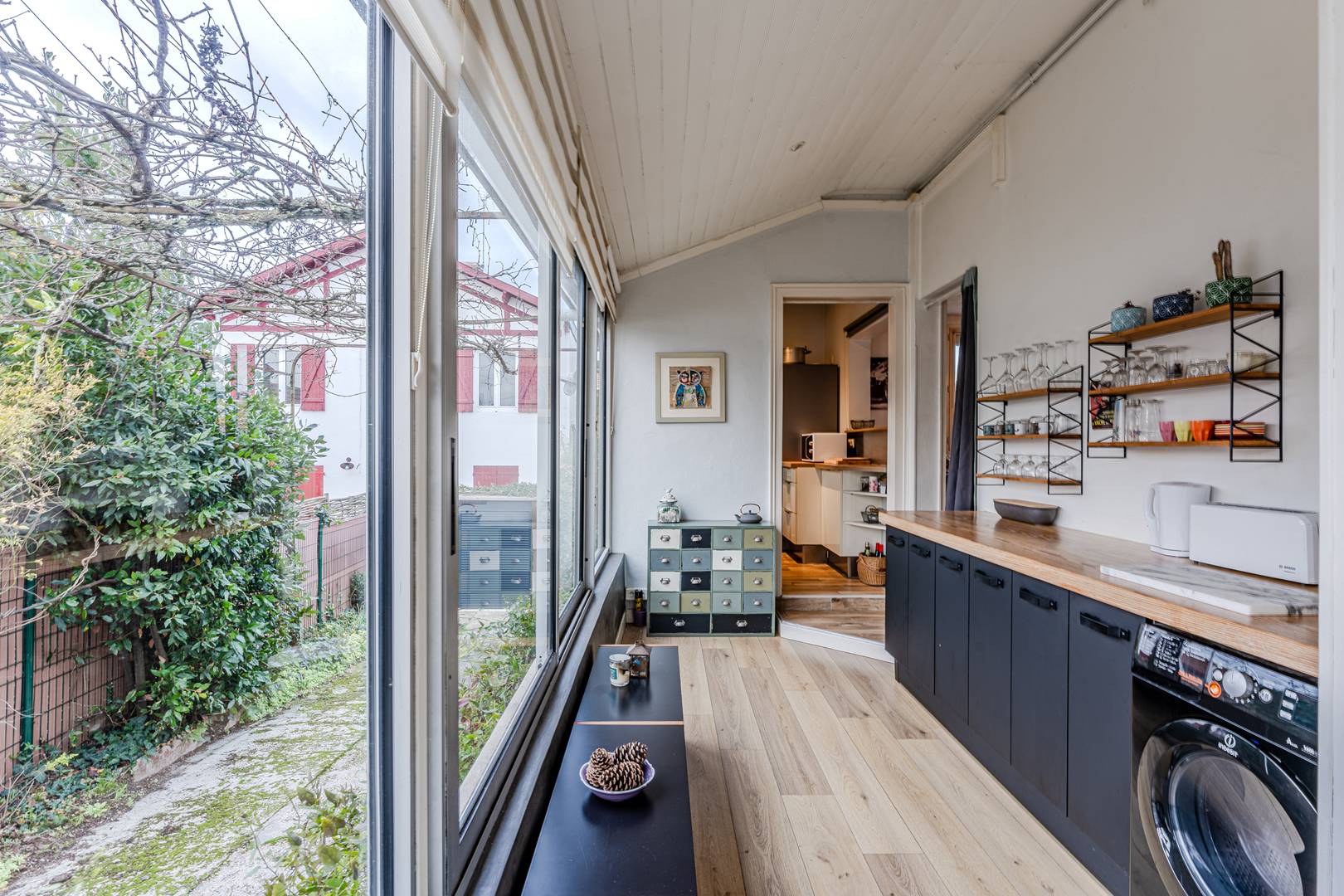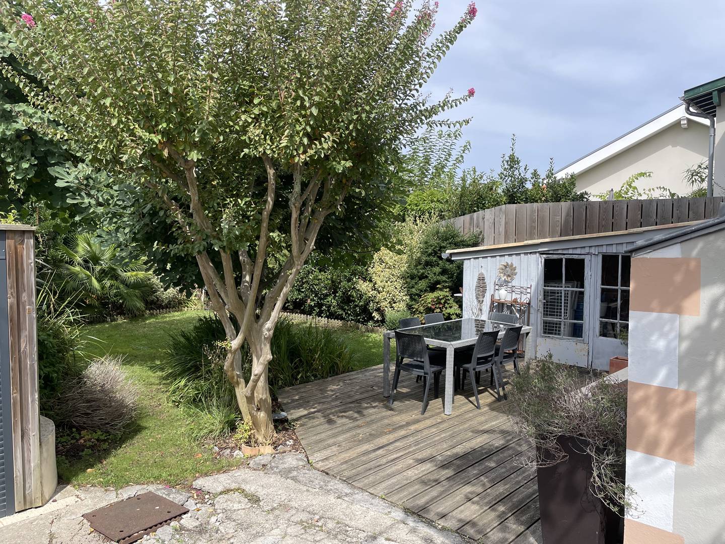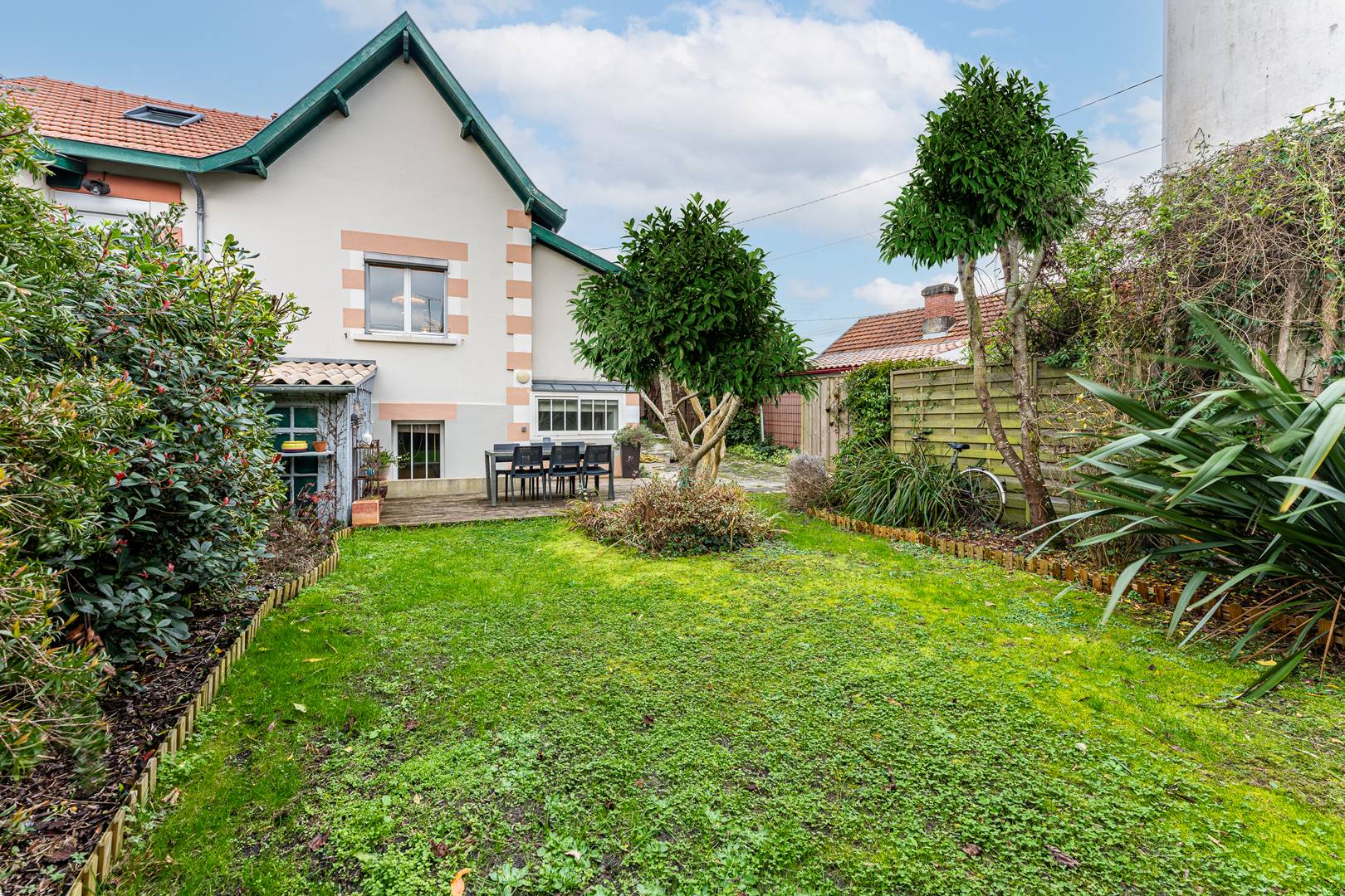 Au rez-de-chaussée, une entrée mène à une salle à manger et à un salon lumineux orienté ouest, offrant une jolie vue sur le jardin. La cuisine, entièrement équipée (réfrigérateur-congélateur, plaques induction, hotte, micro-ondes, four, lave-vaisselle), s’accompagne d’une arrière-cuisine vitrée qui ouvre sur un passage privé vers le jardin, idéalement aménagée avec rangements et lave-linge. Un placard de rangement et des WC séparés complètent cet espace.