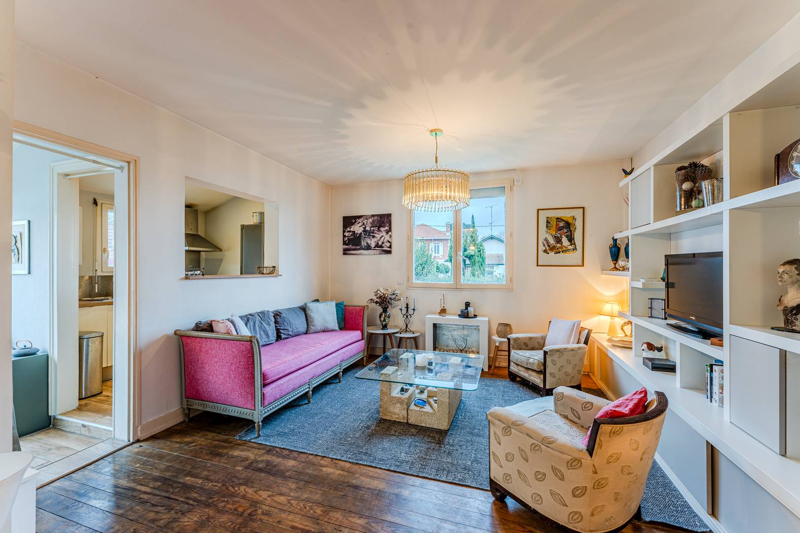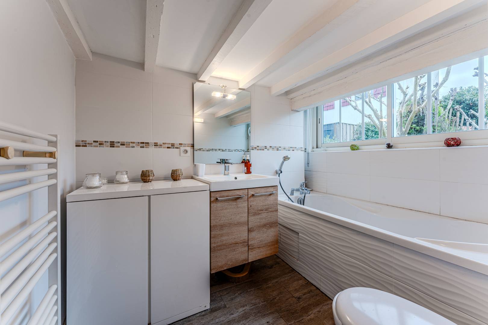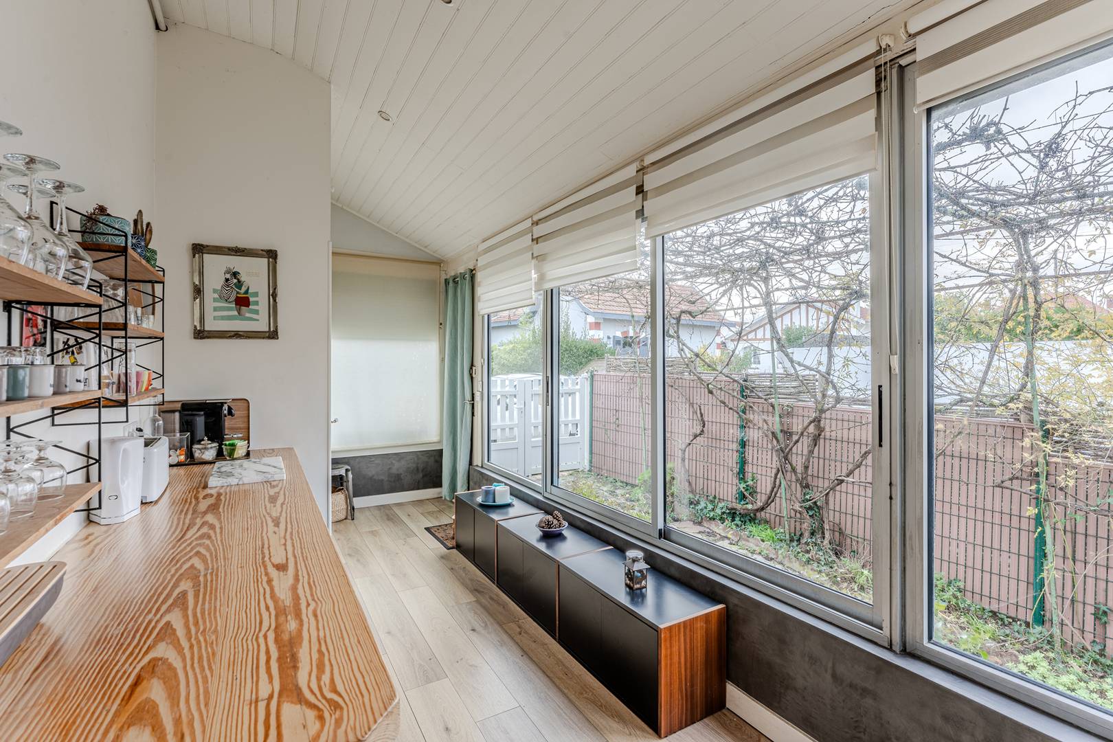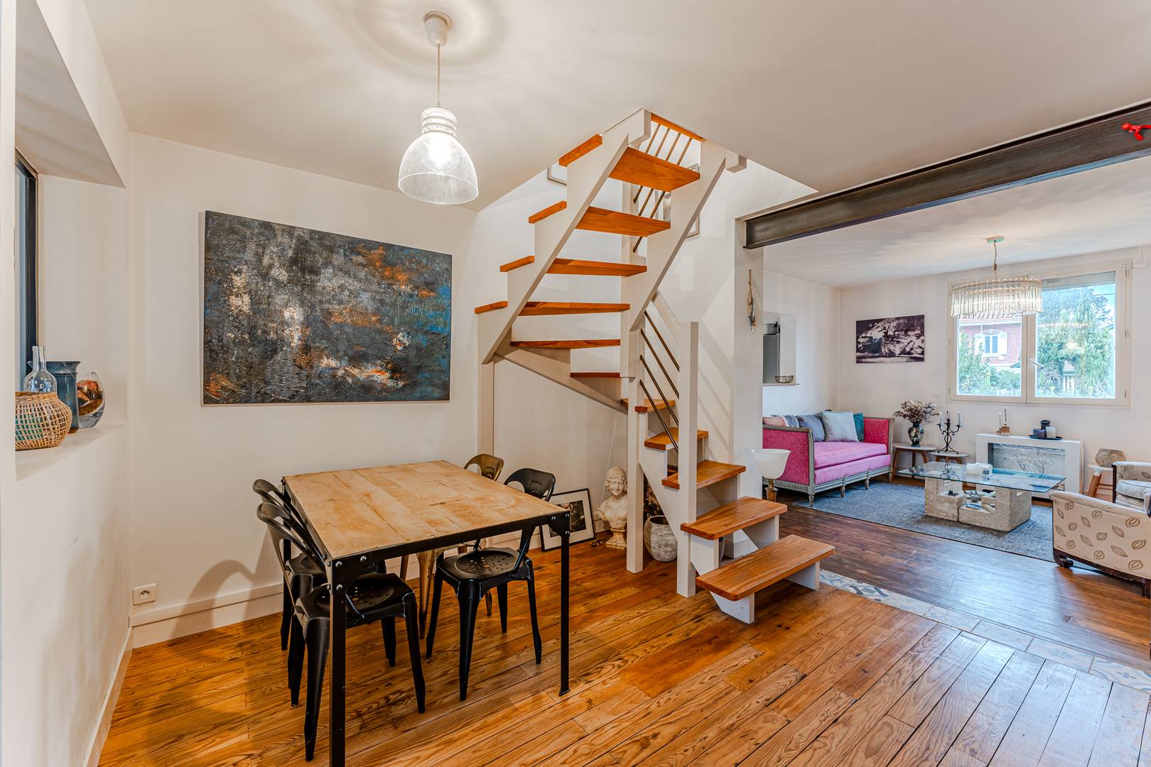 Au rez-de-chaussée, une entrée mène à une salle à manger et à un salon lumineux orienté ouest, offrant une jolie vue sur le jardin. La cuisine, entièrement équipée (réfrigérateur-congélateur, plaques induction, hotte, micro-ondes, four, lave-vaisselle), s’accompagne d’une arrière-cuisine vitrée qui ouvre sur un passage privé vers le jardin, idéalement aménagée avec rangements et lave-linge. Un placard de rangement et des WC séparés complètent cet espace.