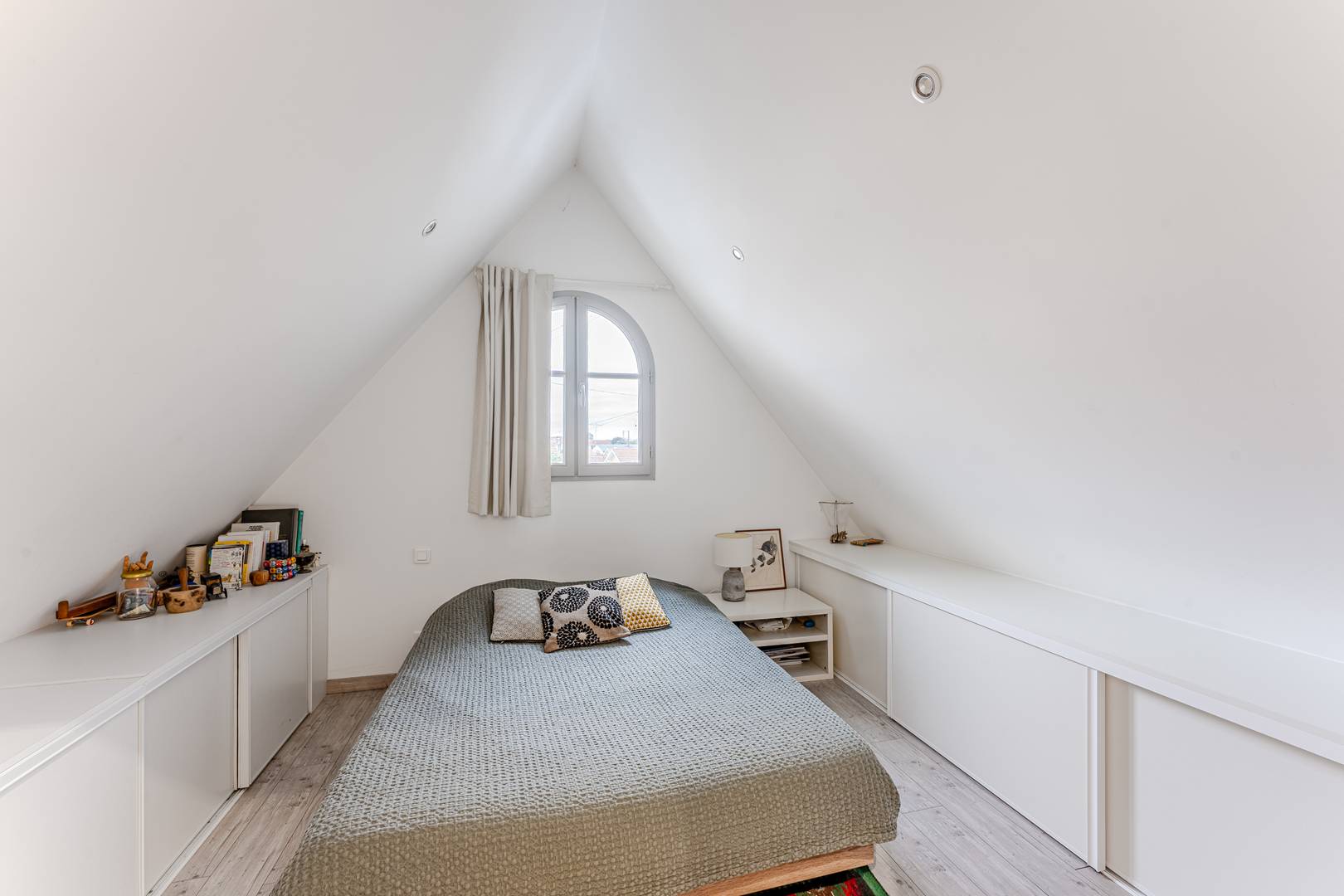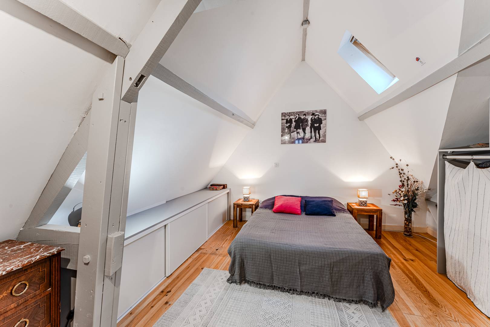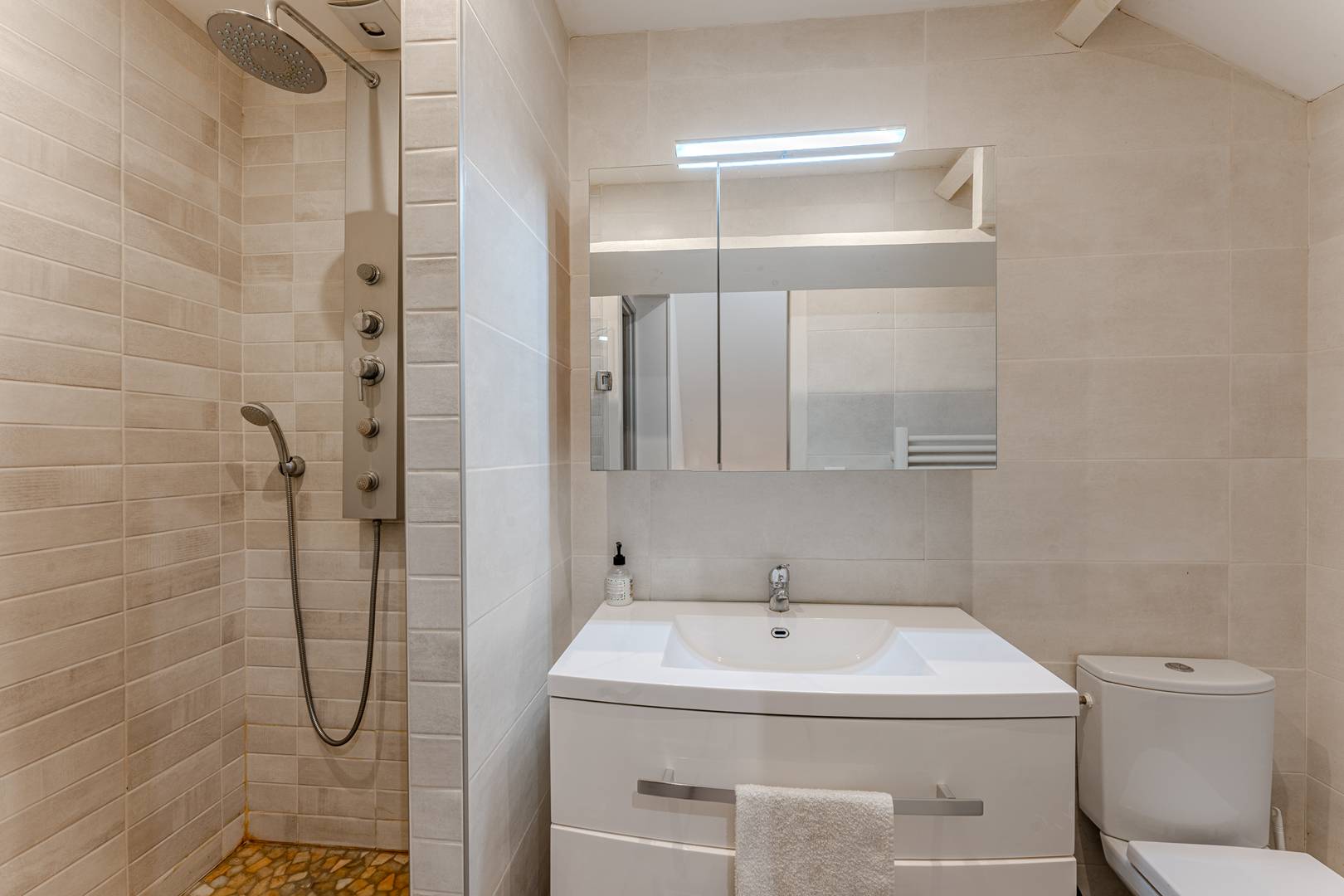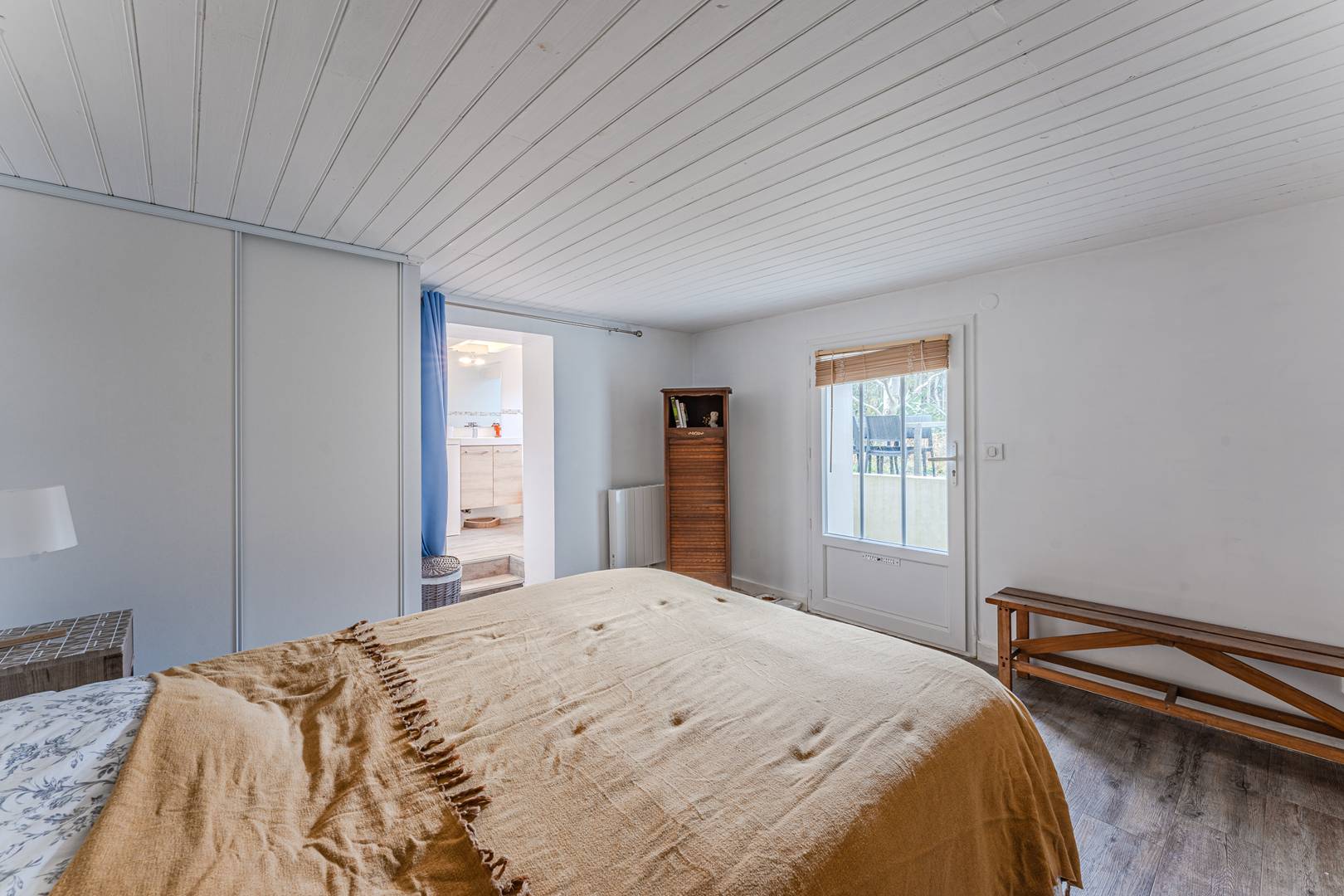 À l’étage, le palier dessert une 1ère chambre exposée est, avec un lit double (140 cm) et un placard, ainsi qu’une salle d’eau avec WC et une 2ème chambre orientée nord, éclairée par un Velux, avec également un lit double (140 cm) et un placard. En rez-de-jardin, accessible par l’extérieur, se trouve une suite parentale comprenant une chambre avec lit double (140 cm) et une salle de bain avec sanibroyeur (attention, hauteur sous plafond limitée !).