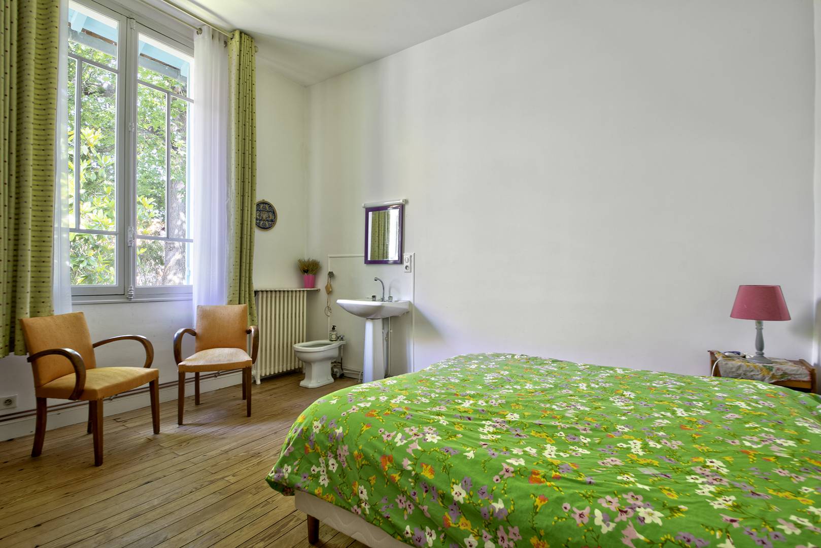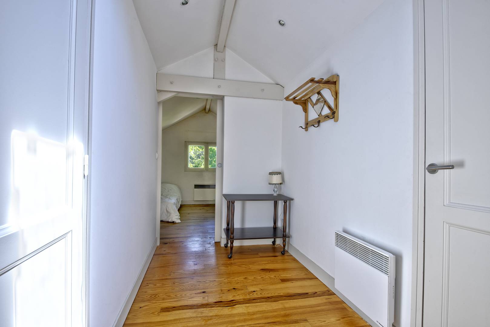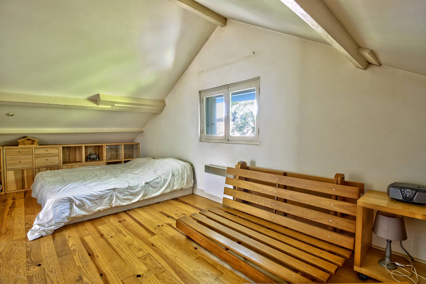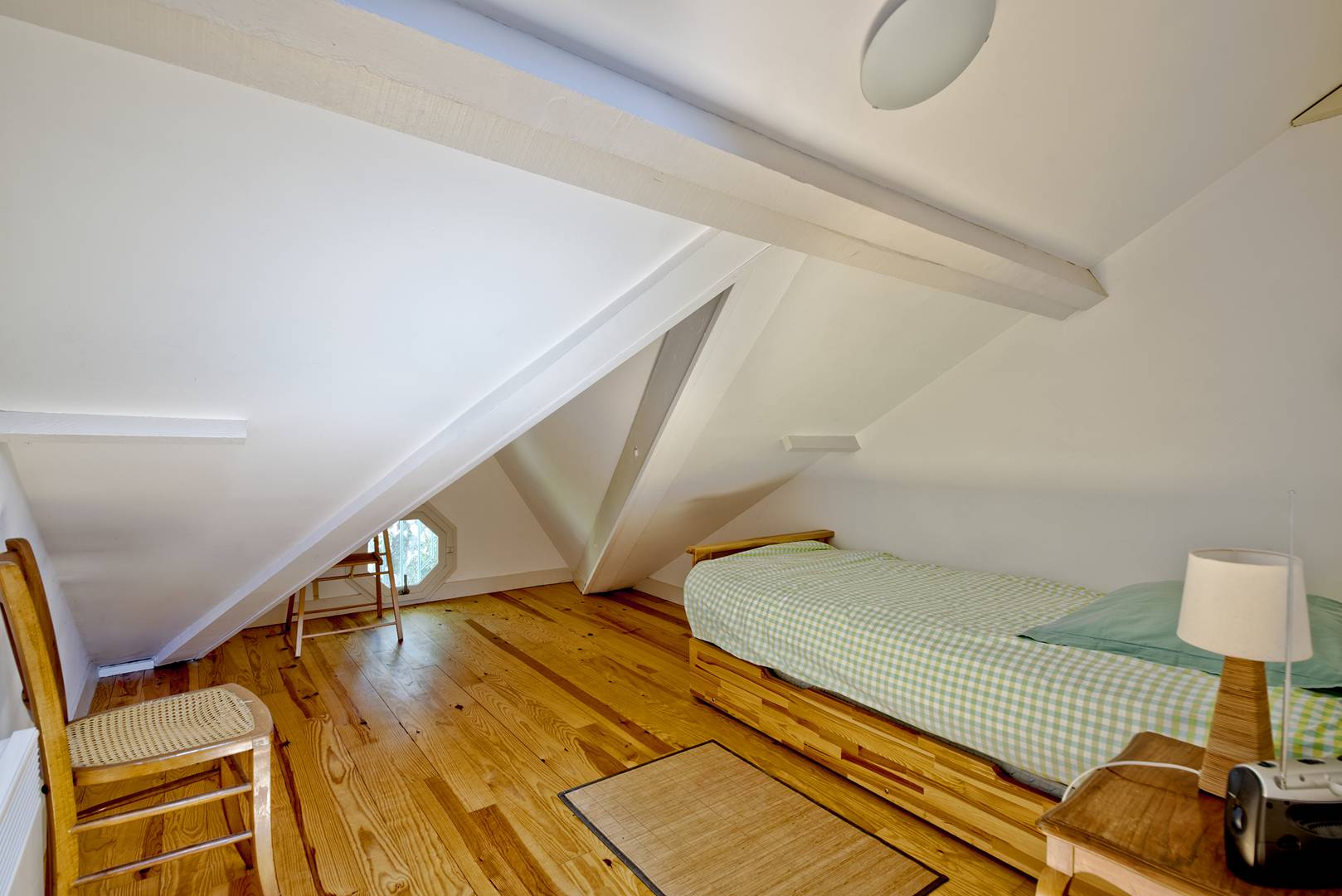À l'étage, un palier mène à une salle de bain avec douche à l’italienne, des toilettes indépendantes, et trois chambres supplémentaires : une exposée à l'ouest avec un lit gigogne (2 lits simples (90), une exposée à l'est avec un lit gigogne (2 lits simples en 90), et une autre exposée au nord avec deux lits simples (90) rapprochés.