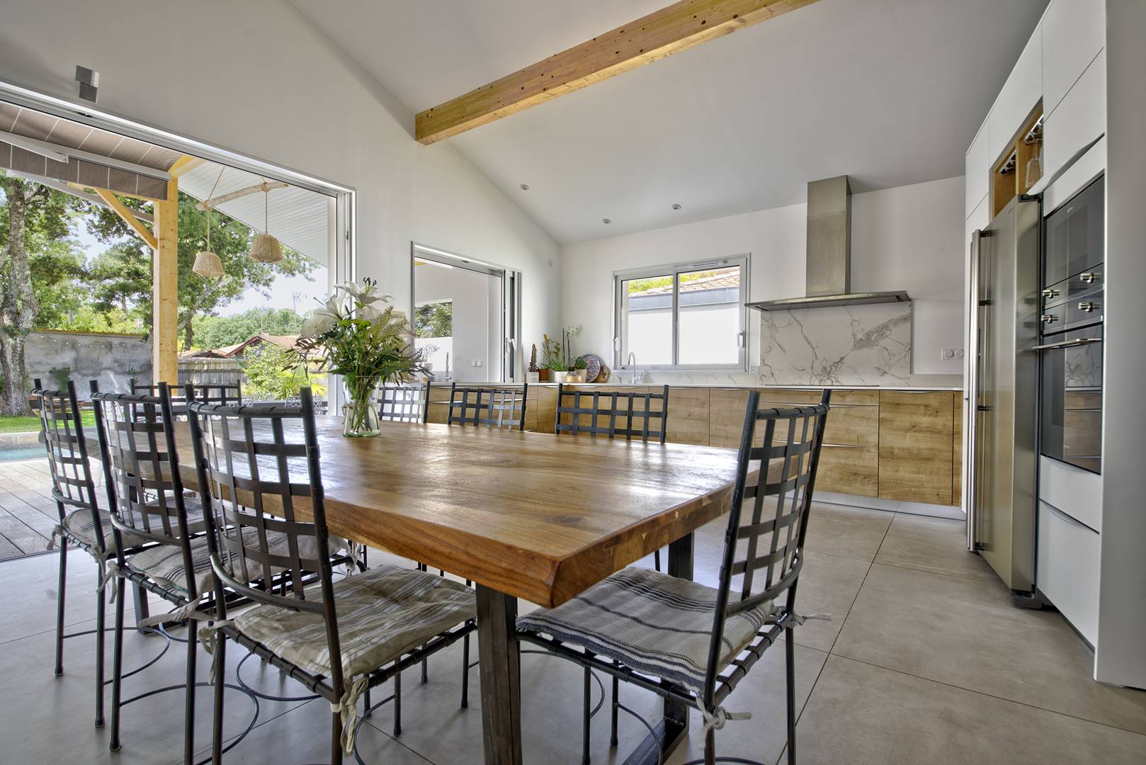 À l'extérieur, vous profiterez d'une grande terrasse de 70 m² avec une cuisine, parfaite pour prendre vos repas en plein air et profiter du climat agréable de la région. La piscine privée chauffée sera un lieu de détente et de rafraîchissement pendant les journées ensoleillées. Le jardin arboré ajoute une touche de tranquillité et de verdure à l'ensemble de la propriété.