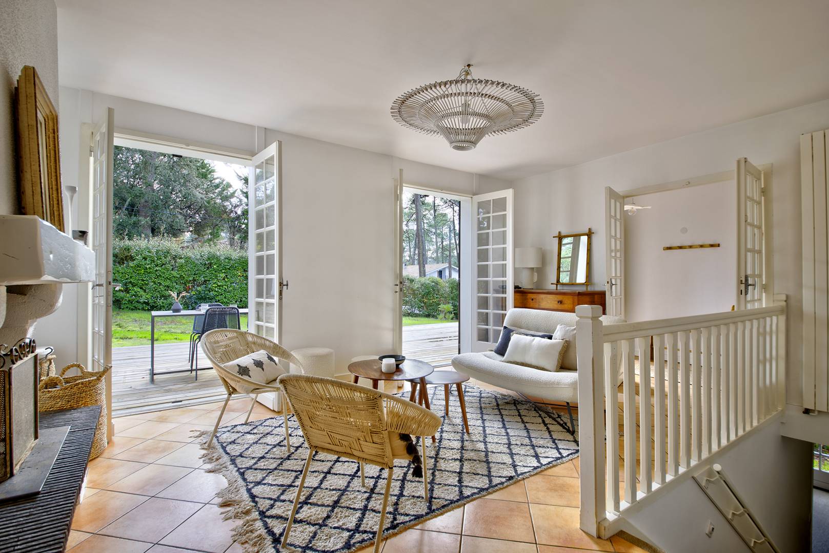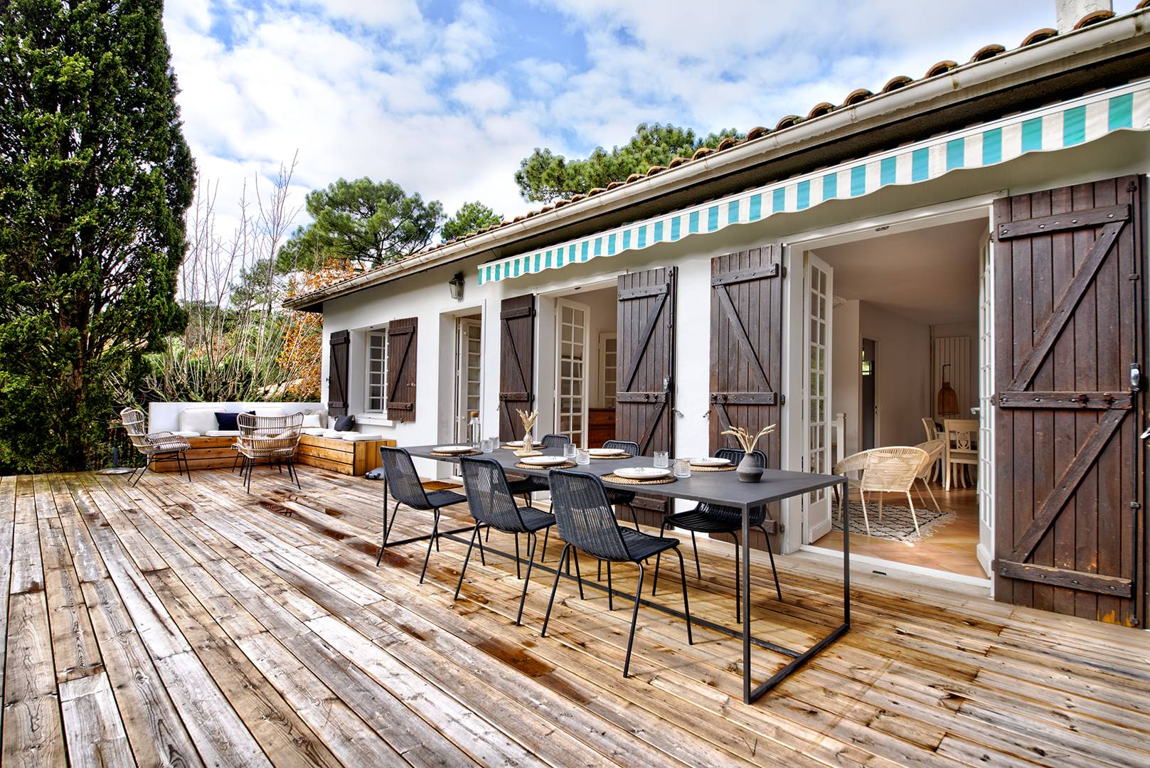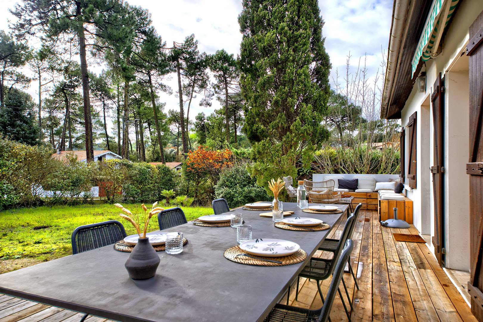 Deux très belles terrasses avec mobilier : une côté Sud (avec store-banne pour se protéger du soleil), une deuxième côté Nord surplombant le jardin. Le grand jardin clos permet de stationner plusieurs véhicules.