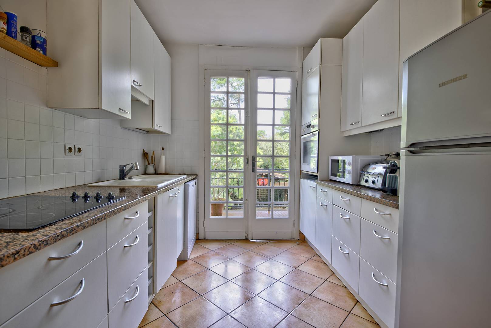 REZ-DE-CHAUSSEE (niveau rue) : Entrée, Couloir menant à une petite salle d'eau, 1ère chambre exposée Ouest : 2 lits superposés en 90, placard, 2ème chambre exposée Sud : 1 lit en 160, placard / penderie, Salle de bain, WC indépendants, Cuisine séparée équipée (plaque vitro. 4 feux, réfrigérateur avec partie congélateur, four traditionnel, four micro-onde, machine Nespresso), avec accès à la terrasse Nord, Grande salle à manger / Séjour (TV, canapé) bénéficiant de deux expositions : Nord et Sud, avec accès aux terrasses.