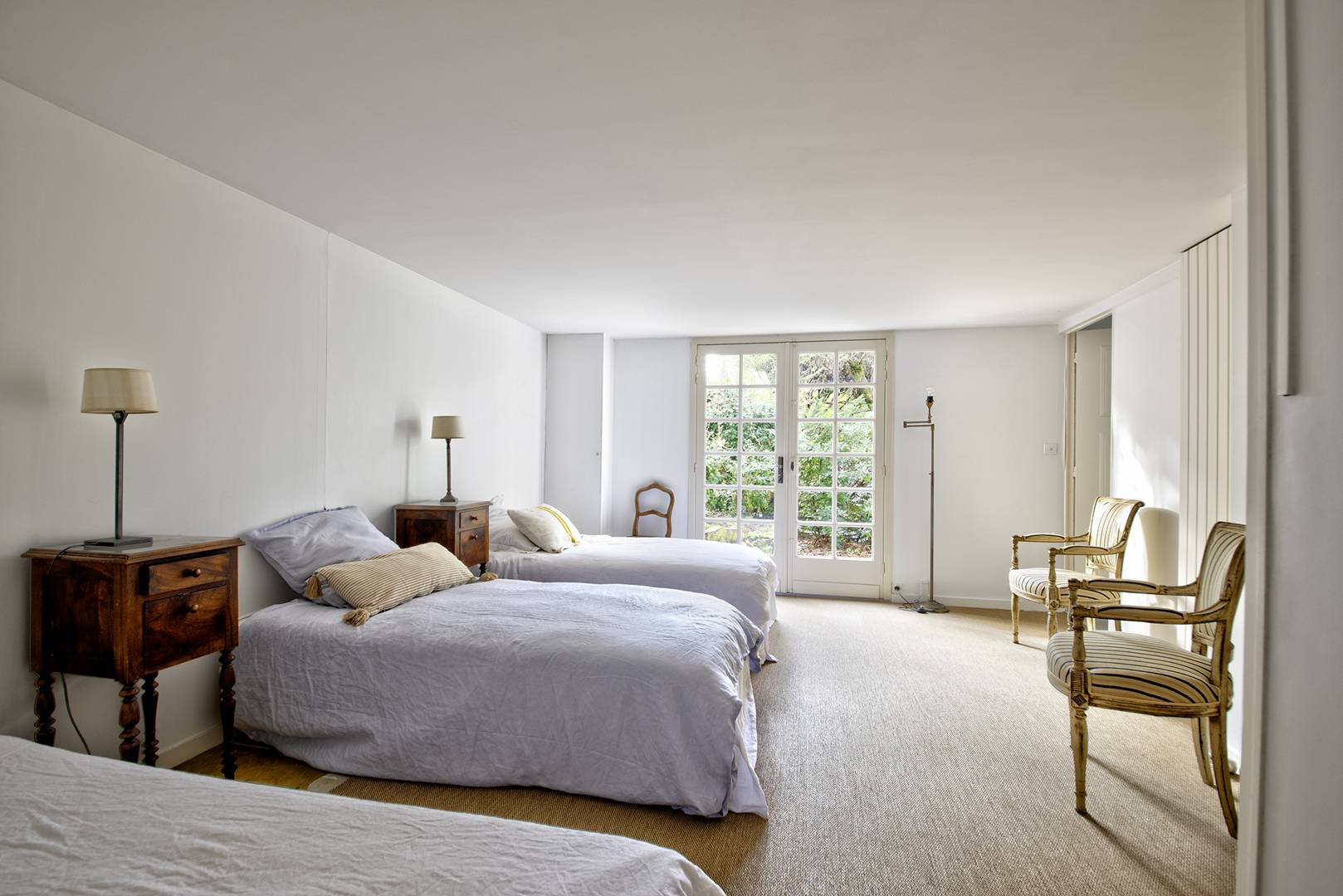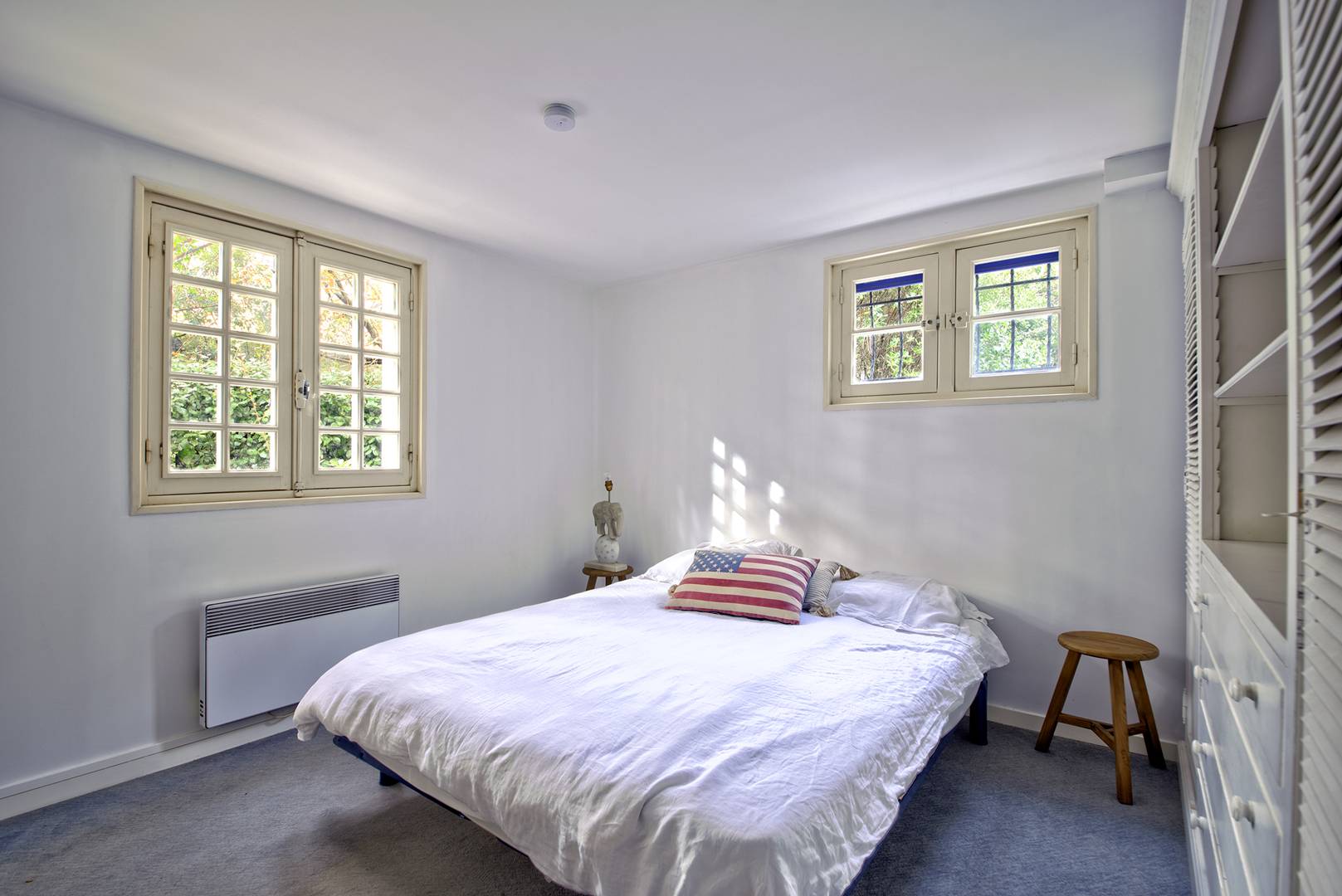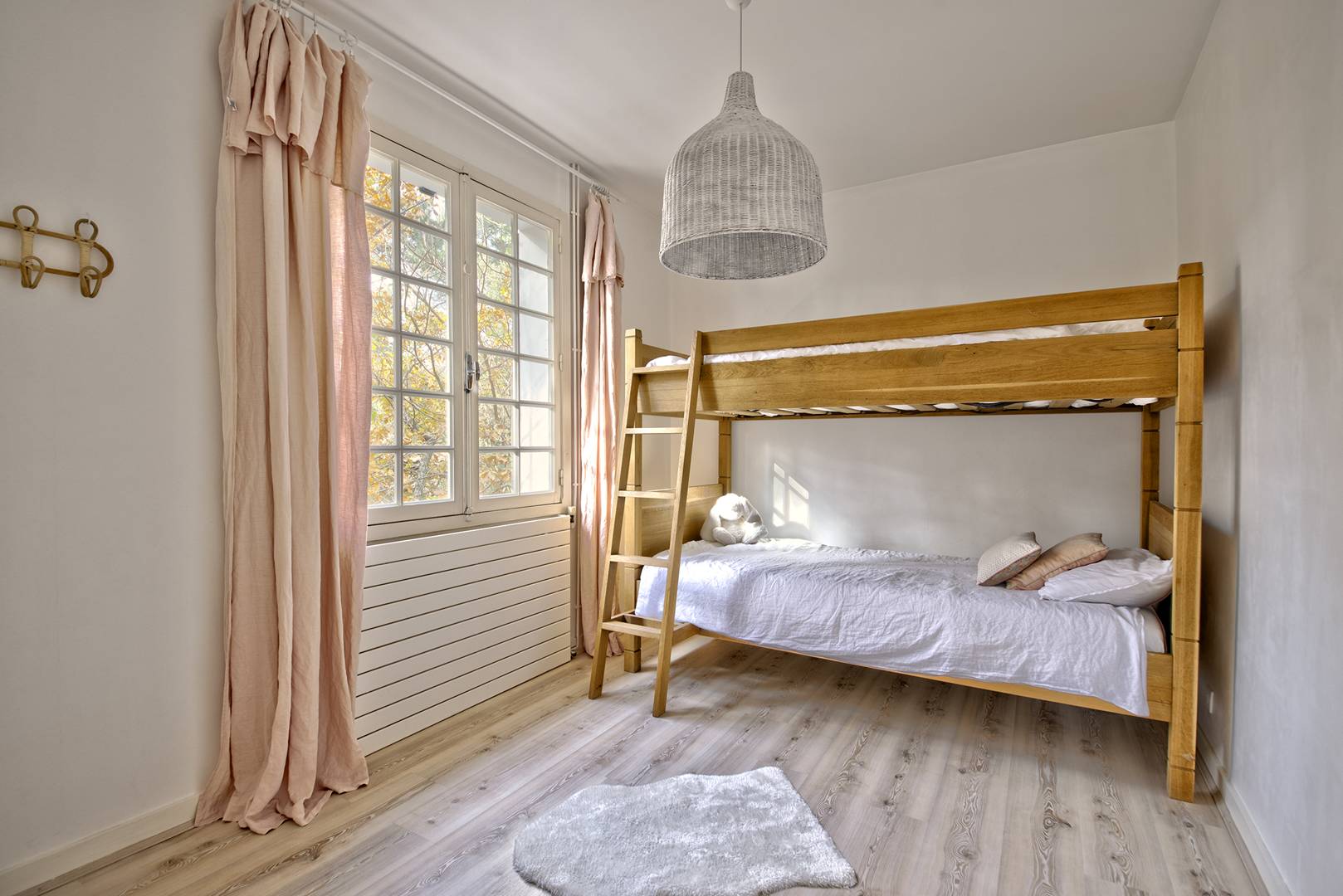 REZ-DE-JARDIN (accès par escalier intérieur) : 3ème chambre (revêtement bolon au sol) exposée Ouest : 3 lits en 90, avec accès au jardin, 4ème chambre (moquette au sol) exposée Ouest : 1 lit en 160, Salle d’eau avec lave-linge.