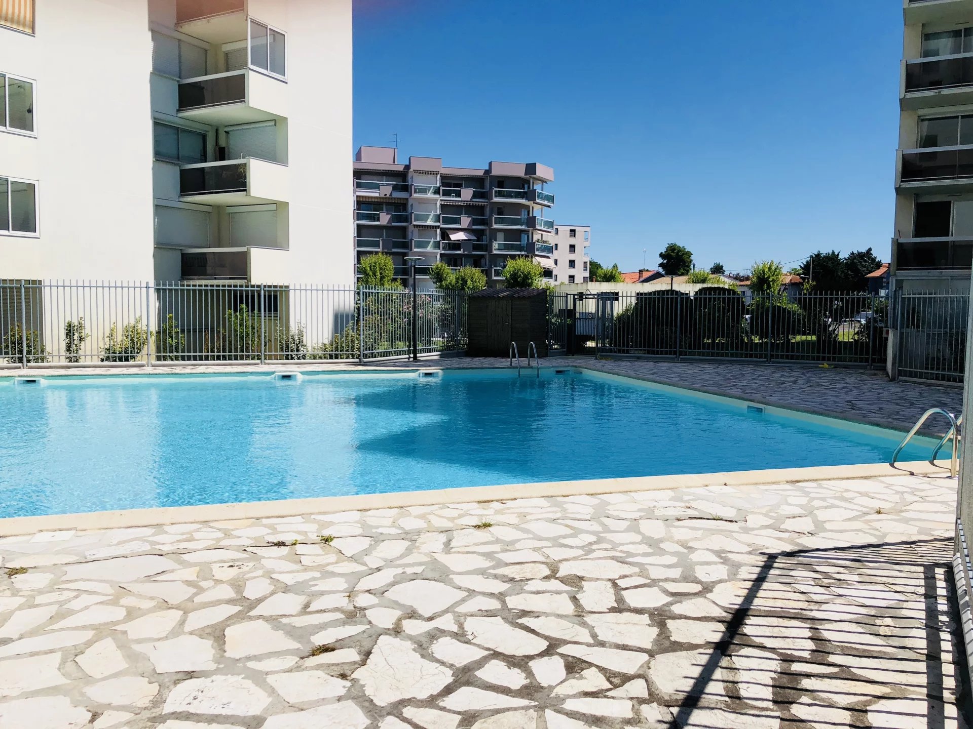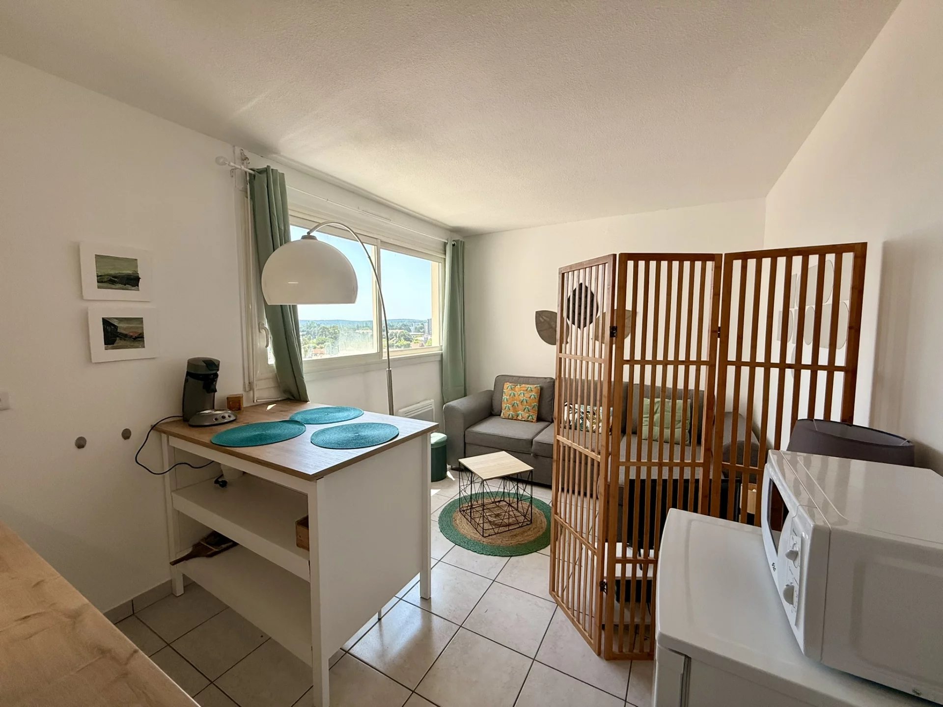 Au 9ème étage d’une résidence sécurisée avec ascenseur, et piscine, studio lumineux avec vue dégagée.