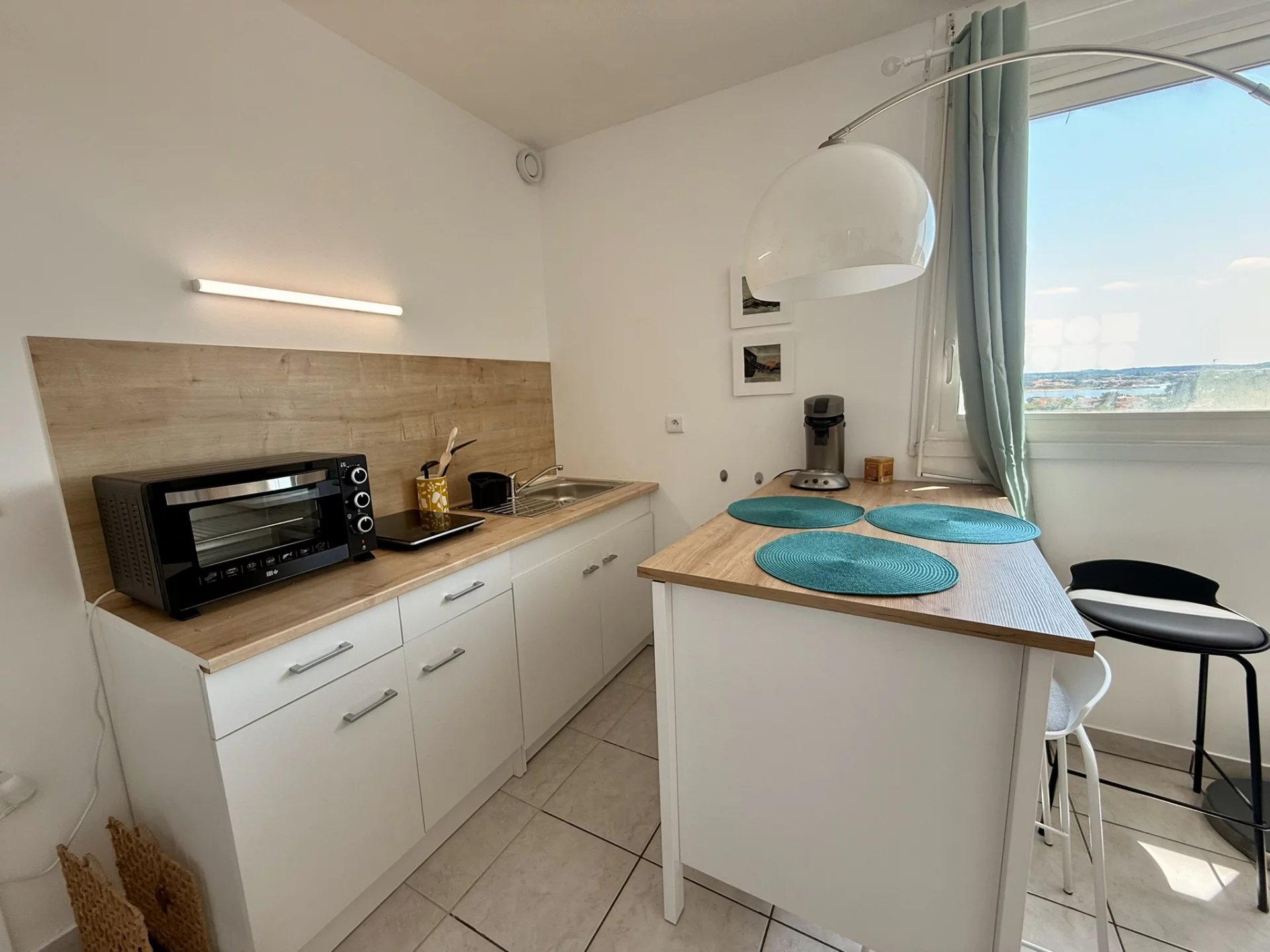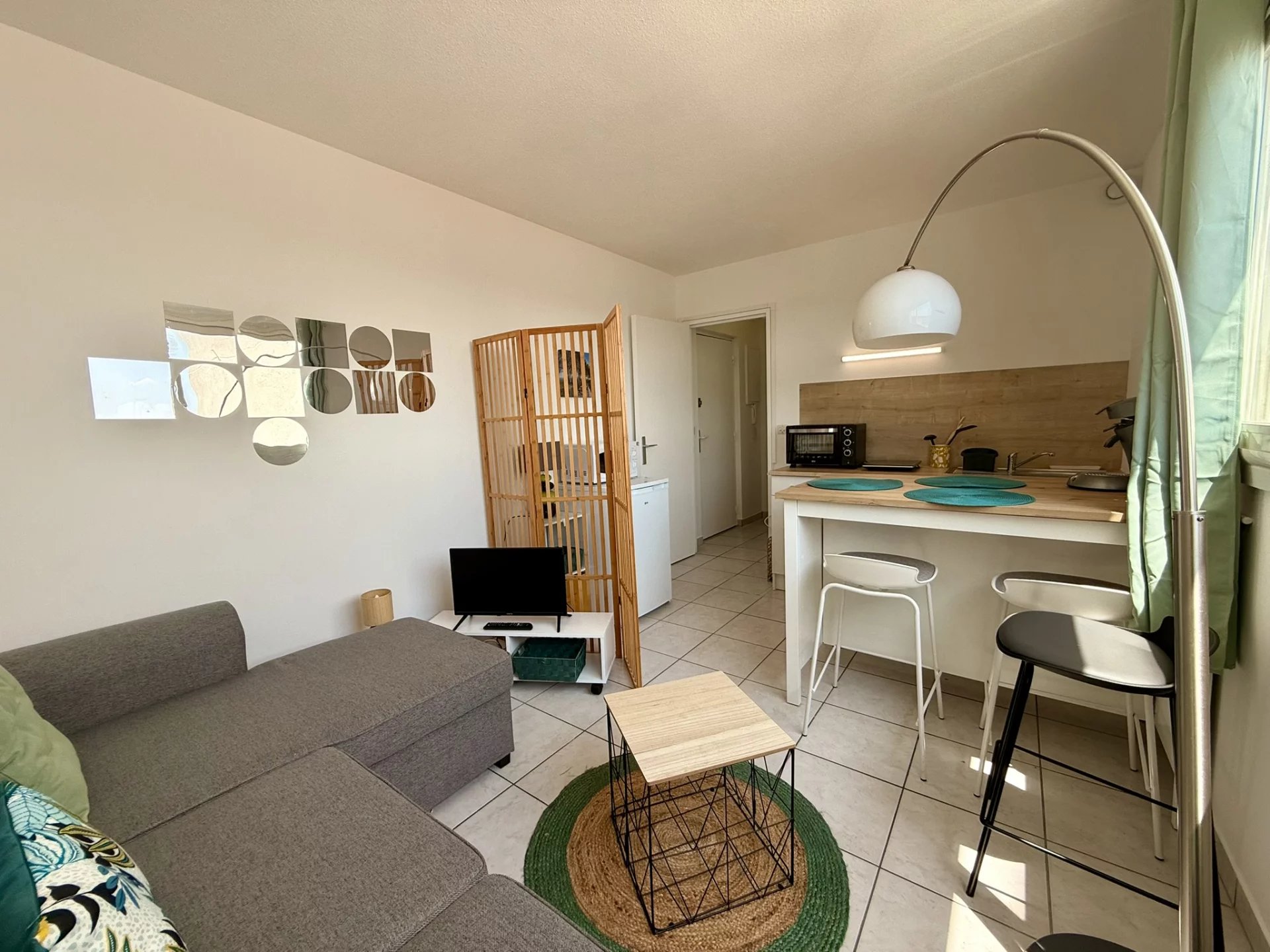 Pièce de vie exposée Sud avec kitchenette équipée, bar repas, canapé convertible et TV. Salle d’eau avec WC.